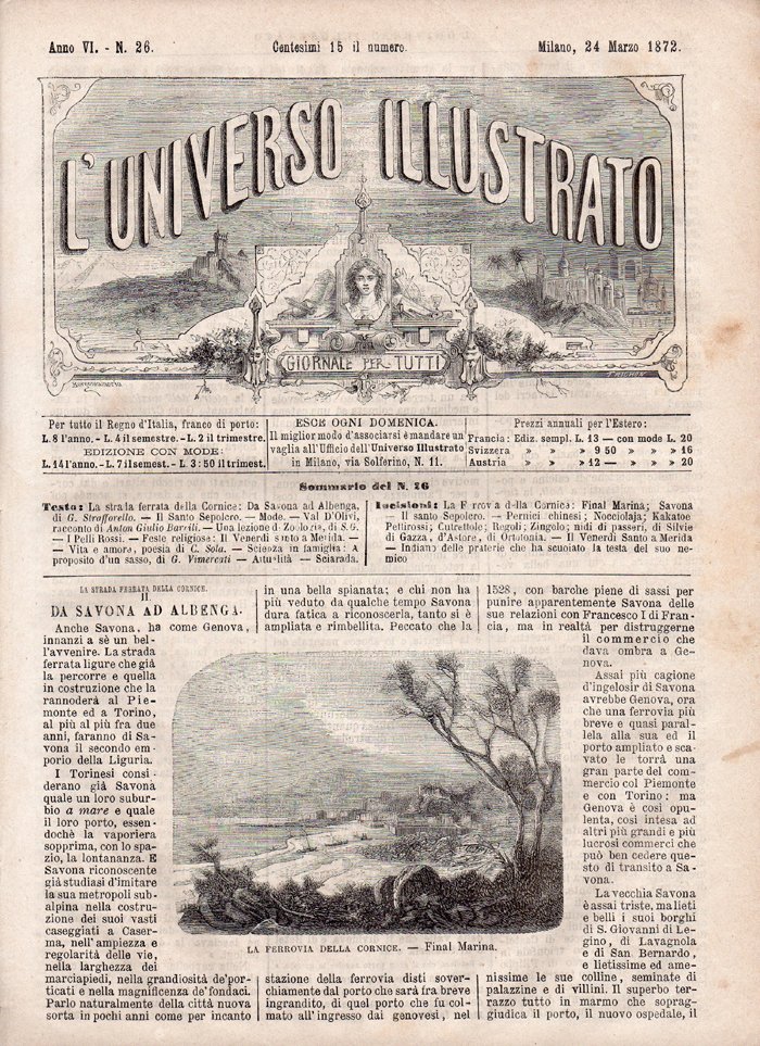 In-4°, pp. 16 (da p. 413 a p. 428). Fascicolo completo proveniente da rilegatura, illustrato da incisioni in bianco e nero. Normali segni d'uso e del tempo, per il resto, ben conservato. Sommario: La strada ferrata della Cornice. II. Da Savona ad Albenga, di G. Strafforello, con due incisioni raffiguranti "La ferrovia della Cornice. Final Marina" (Finale Marina, Finale Ligure) e "La ferrovia della Cornice. Savona"; Il Santo Sepolcro, con un'incisione raffigurante "Il Santo Sepolcro a Gerusalemme"; Mode; Val d'Olivi, racconto di Anton Giulio Barrili (V, continua); Una lezione di zoologia, di S. G., con due pagine ospitanti 13 incisioni raffiguranti "Nocciolaja", "Nido di passero repubblicano", "Kakatoe", "Silvia cucitrice e suo nido", "Nido di passero", "Pernici chinesi", "Nido di ortotonia", "Nido di gazza", "Pettirossi", "Cutrettole", "Regoli", "Zigolo o Magliarino", "Nido d'astore"; I Pelle Rossa, con un'incisione raffigurante "indiano delle praterie che ha scuoiato la testa del suo nemico"; Feste religiose: Il venerdì santo a Merida, di Charnay, con un'incisione a piena pagina raffigurante una cerimonia religiosa; Vita e amore, poesia di C. Sola; Scienza in famiglia: A proposito di un sasso, di G. Vimercati (un serpentino); Attualità: Mondo letterario (si informa dell'uscita del volume La contessa di Melzo, di Luigi Capranica e circa il numero di oper prodotte dalla libreria tedesca nel 1870) - Mondo scientifico (si dà notizia dell'attribuzione a G. V. Schiaparelli, direttore dell'Osservatorio di Brera, della medaglia d'oro della Società Reale astronomica di Londra e della pubblicazione del libro di di Gustavo Strafforello Nuovi principii di geologia e paleontologia) - Mondo artistico (si informa circa le vendite di quadri eseguite da due gallerie di Parigi) - Concorsi e premi (si comunica il conferimento al dottor Alfonso Corradi del premio della fondazione Gaiani conferito dalla Società medico-chirurgica di Bologna, al cavalier Clemente Pizzamiglio del premio straordinario del concorso Ravizza, a Giovanni Bolzoni, di Parma, maestro e direttore del teatro di Savona, del premio per quartetto d'archi messo in palio dalla Società del Quartetto di Milano per il 1871) - Istruzione pubblica (tratta delle scuole e delle università in Germania) - Invenzioni (si tratta dell'Autosistema telegrafico Meardi-Garrone) - Mondo teatrale (si dà brevemente conto della riuscita di una rappresentazione delle opere La donna vendicativa, di Carlo Goldoni, Daniele Manin, di Delobarc e Dhormenon, Piero di Calais, del maestro Aspa, Caterina di Guisa, del maestro Gandolfi, Impara l'arte, di Leo Castelnuovo, Il conte di Montréalm di Gandolfi) - Necrologia (necrologio di Augusto Luchet, autore drammatico francese, Bogumil Dawison, artista drammatico, Michel Levy, medico); Sciarada