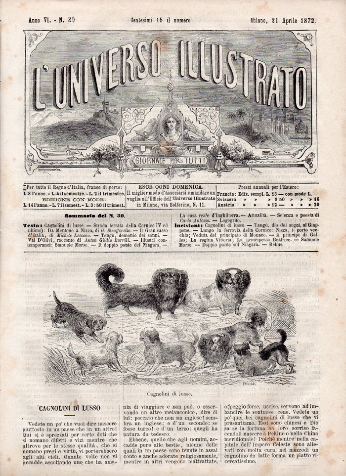 In-4°, pp. 16 (da p. 477 a p. 492). Fascicolo completo proveniente da rilegatura, illustrato da incisioni in bianco e nero. Normali segni d'uso e del tempo, per il resto, ben conservato. Sommario: Cagnolini di lusso, con un'incisione raffigurante sette tipi di cani di piccola taglia; Strada ferrata della Cornice. V ed ultimo. Da Mentone a Nizza, di G. Strafforello, con due incisioni raffiguranti "Lungo la ferrovia della Cornice. Nizza: il Porto vecchio", a piena pagina, e "Strada ferrata della Cornice. Veduta del Principato di Monaco", che occupa la metà inferiore di una doppia pagina; Il Gran Sasso d'italia, di Michele Lessona; Il demonio dei sonni, con un'incisione a piena pagina raffigurante "Tangù, Dio dei sogni, al Giappone"; Val d'Olivi, racconto di Anton Giulio Barrili (continuazione, vedi il n. 29); Illustri contemporanei: Samuele Morse, con un ritratto inciso; Il doppio ponte del Niagara, con un'incisione a doppia pagina raffigurante "Il doppio ponte sul Niagara"; La casa reale d'Inghilterra, con cinque piccole incisioni raffiguranti "Il principe di Galles", "La principessa di Galles", lo stemma del Regno Unito, "La regina Vittoria", "La principessa Beatrice"; Attualità: Mondo letterario (si comunica l'uscita di un opuscolo intitolato Il sentimento religioso in Italia, del prof. Ercole Vidari) - Industria (si danno alcune cifre dell'industria cotoniera) - Concorsi e premi (si comunica il tema per il 1872 del concorso Ravizza) - Necrologia (necrologio di: Gaetano Magazzari; Nicolò Matas, architetto); Scienza e poesia, di Carlo Anfosso; Logogrifo; Rebus.