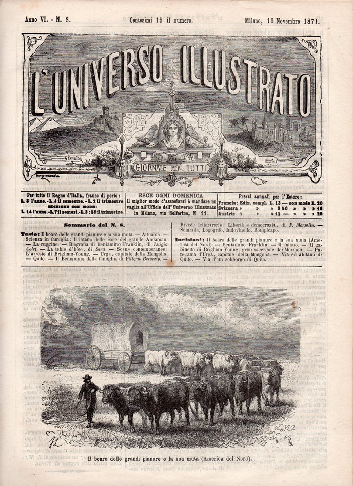In-4°, pp. 16 (da p. 117 a p. 132). Fascicolo completo proveniente da rilegatura, illustrato da incisioni in bianco e nero. Normali segni d'uso e del tempo, per il resto, ben conservato. Sommario: Il boaro delle grandi pianure e la sua muta, con un'incisione raffigurante "Il boaro delle grandi pianure e la sua muta (America del Nord)"; Attualità: Mondo letterario (si dà notizia dell'uscita di nuove opere politiche, della pubblicazione del volume Notizie storiche-artistiche sui primari palazzi principeschi d'Italia del conte Giuseppe Sugana, della tiratura dei giornali inglesi, dell'uscita di un volume intitolato Dante e Goefhe, della pubblicazione dello scritto La Cronica di Dino Compagni, opera di Antonfrancesco Doni, di Giusto Grion, e dei volumi Angelo Mai e le sue principali scoperte, di Astorre Pellegrini e I fattori e le leggi dell'incivilimento, discorso intorno a Gian Domenico Romagnosi, di Bartolomeo Fontana) - Concorsi (si avverte della scadenza di un concorso indetto dal Comitato promotore della celebrazione del quarto centenario di Niccolò Machiavelli) - Mondo teatrale (si informa circa l'esito di rappresentazioni di opere di Duroni, di Cletto Arrighi e di Leopoldo Marenco) - Necrologia (necrologio del generale Anderson, statunitense); Scienza in famiglia: Il latano dell'isola del grande Andaman, (Isole Andamane, Oceano Indiano), con un'incisione a piena pagina raffigurante "Il latano"; La ruggine (malattia del grano); Vita d'uomini illustri: Beniamino Franklin, di Luigia Colet, con un ritratto inciso; La table d'hôte, di Sara; Scene contemporanee: L'arresto di Brigham-Young, con un'incisione a piena pagina raffigurante "Il gabinetto di Brigham-Young, gran sacerdote dei Mormoni (arrestato il 2 ottobre dal governo americano)"; Urga, capitale della Mongolia, con un'incisione a piena pagina raffigurante "Panorama d'Urga, capitale della Mongolia"; Quito (capitale dell'Ecuador), con due incisioni raffiguranti "Via ed abitanti di Quito (Equatore)", a pena pagina, e "Via d'un sobborgo a Quito (Equatore)", Il beniamino della famiglia, racconto di Vittorio Bersezio (Continuazione, vedi n. 7); Sciarada; Anagramma; Logogrifo; Rompicapo; Riviste letterarie: Libertà e democrazia. Studi sulle rappresentanze delle minorità, di Attilio Brunialti, Milano, Treves, 1871, di B. Morsolin (continua).
