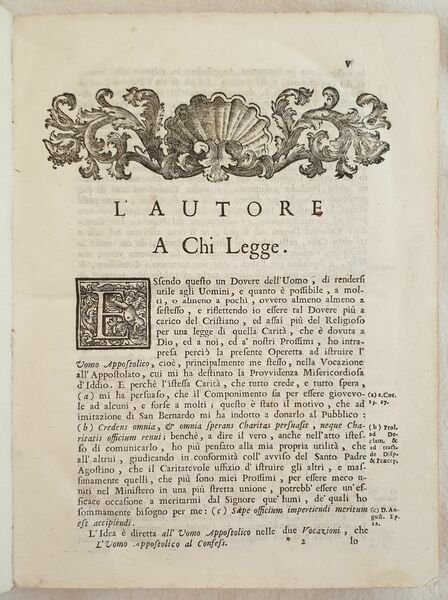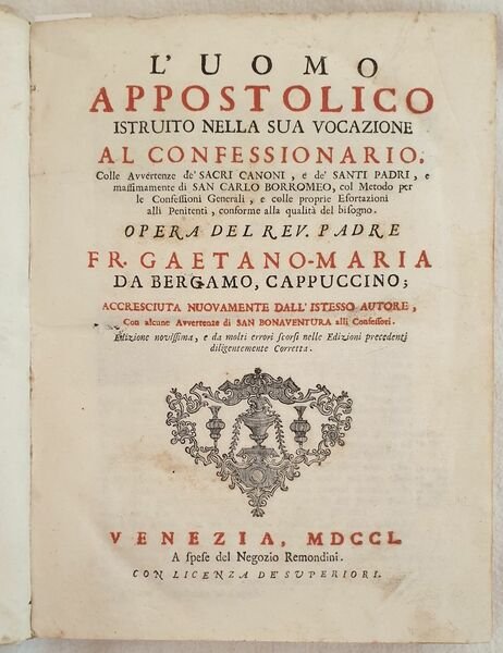 Bella edizione del 1750 di questa interessante opera del Padre Gaetano Maria da Bergamo (1672-1753) sacerdote dell'Ordine dei Minori Cappuccini, predicatore teologo, scrittore ascetico studioso di matematica nato e morto a Bergamo. L'opera è in un volume ed è completa. L'opra è ad uso del confessore e delle regole da seguire durante la confessione. All'interno: il confessore deve avere la proibita nel costumi, restituzioni e compensazioni, contratti, impenitenti, esortazioni nelle confessioni, Il vizio dell'osteria ecc. In ottime condizioni. Copertina in piena pergamena coeva con titolo manoscritto al dorso in ottime condizioni generali con lievi usure ai margini e dorso. Legatura in buone condizioni. All'interno le pagine si presentano in ottime condizioni con rare fioriture. In 8. Dim. 24x18 cm. Pp. XII+460.Beautiful edition of 1750 of this interesting work by the father Gaetano Maria da Bergamo (1672-1753) priest of the Order of Minor Friar, preecher theologist, writer ascetical scholar of mathematics born and dead in Bergamo.<BR>The work is in one volume and it is complete. The work is for the usage of confessors and lists the rules to follow during confession. Inside: prohibited costumes in confessor, restitutions and compensations, contracts, vice of pub ecc. In very good conditions. Parchment coeval cover in very goodgood general conditions slightly worn in the edges and spine. Binding in good conditions. Inside pages are in very good conditions with occasional foxings. Slight humidity stains inside. In 8. Dim. 24x18 cm. Pp. XII+460.