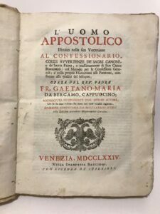 [vt] .colle avvertenze de'sagri canoni e de' Santi Padri, e massimamente di San Carlo Borromeo: col Metodo per le Confessioni Generali; e colle proprie Esortazioni alli Penitenti, conforme alla qualita' del bisogno. Accresciuta nuovamente dall'istesso autore, che le hadato l'ultima sua mano con varie notabili Aggiunte. Edizione duodecima da molti errori scorsi nelle Edizioni precedenti diligentemente Corretta. Testo su due colonne, frontespizio in rosso e nero con marca tipografica incisa. Una tavola piu' volte ripiegata riguardante i peccati di lussuria. Fori di tarlo al dorso, copertina in parte staccata, ordinari segni del tempo, buono nel complesso. Pagg. XII, 408. Cartonato originale Mis mm 260x190