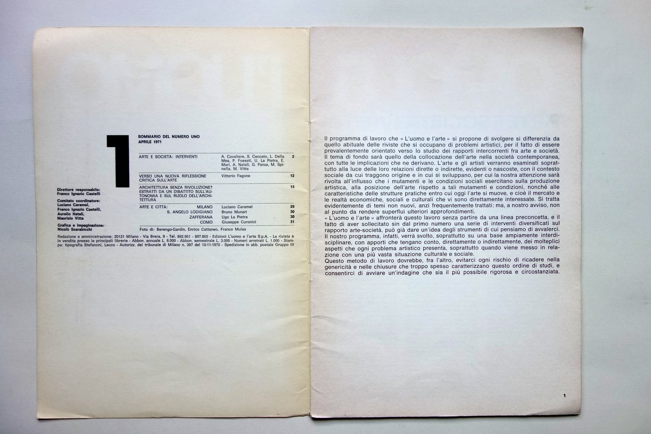 AA. VV., L'Uomo e l'Arte" numero 1 aprile 1971 Milano, 1971; cm 29x20,5; pp. 32 con qualche ill. fotografica in b/n nel t.; brossura ed. Numero completo. Condizioni di conservazione Esemplare in buone condizioni con tracce d'uso, minuscole abrasioni alle cuffie. Qualche pagina con marginali segnetti a penna blu, interni peraltro ottimi. Primo numero di rivista che vide la collaborazione di importanti artisti, architetti, designer di quel periodo: Caramel, Munari, Berengo-Gardin, ecc. Per maggiori dettagli vedi foto indice. Completo. OPEB.5525 N "