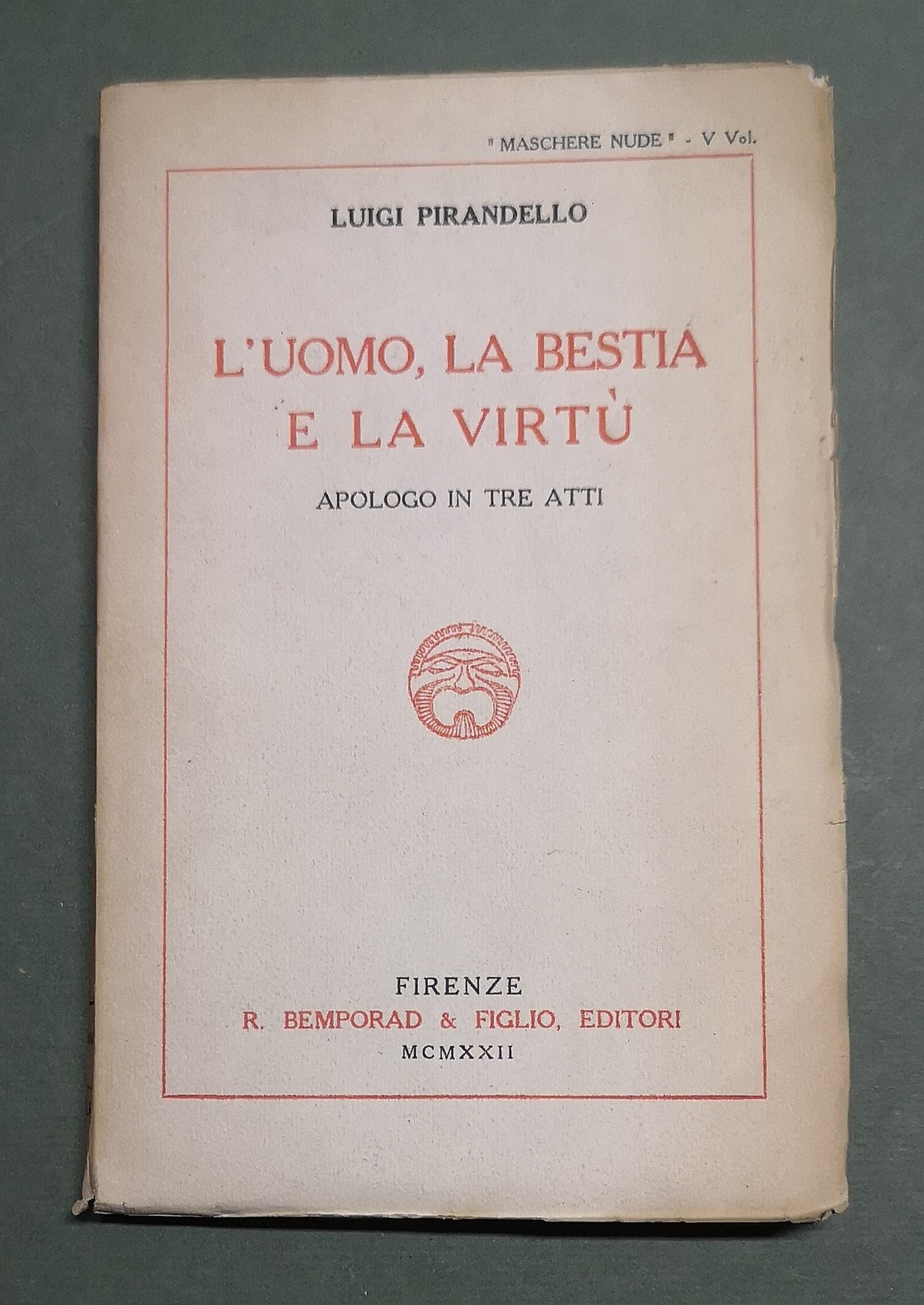 >in-16, pp. (4), 151, broch. edit. Edizione originale in volume. Nel 1919 uscì l'edizione pre-originale all'interno della rivista «Comoedia», 10 settembre 1919 (vedi sche da n. 417). Lo Vecchio-Musti pp. 146 e 153.