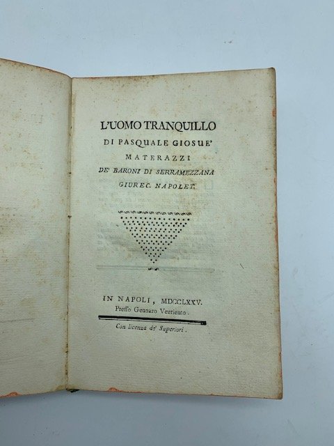 In 8 (cm 13 x 19,5), pp. XII + 142 + (2) bianche. Legatura coeva in mezza pelle con piatti rivestiti con carta decorata, con abrasioni e scoloriture ai piatti, legatura nel complesso un po' stanca. Edizione originale di questo trattato morale-filosofico scritto da Pasquale Giosue Materazzi dei Baroni di Serramezana.