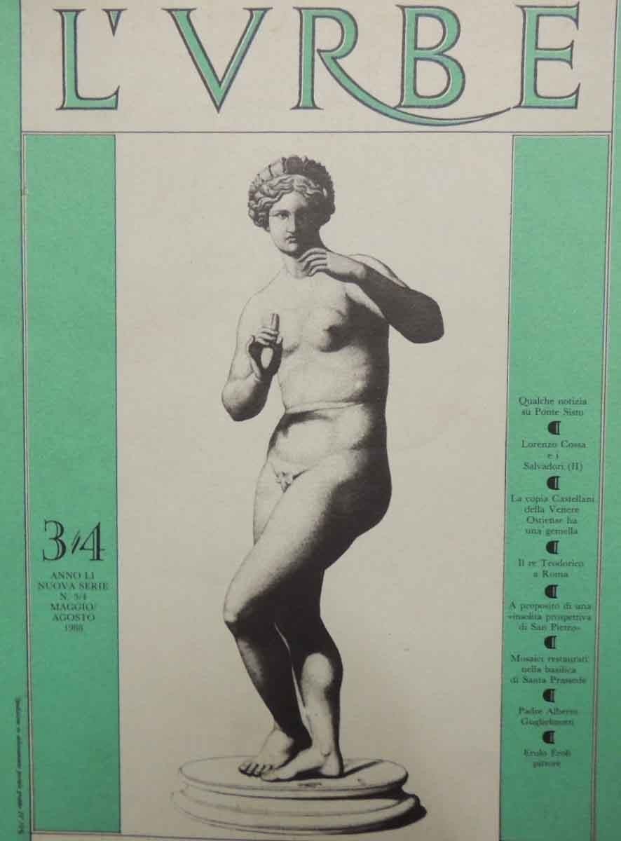 L’Urbe. Rivista romana bimestrale, anno LI, Nuova Serie, nn. 3-4, maggio-agosto 1988, Fratelli Palombi Editori, Roma 1988, pp. 82, VIII, ill. b.n., cm 26, br. ed. Indice: Gaetano Marelli Mariani, Qualche notizia su Ponte Sisto - Nello Vian, Lorenzo Cossa e i Salvadori (II) – Maurizio Donati, La copia Castellani della Venere Ostiense dell’Accademia di San Luca ha una gemella – Mario Marazzi, Il re Teodorico a Roma – Daniela Colafranceschi, A proposito di una insolita prospettiva di San Pietro – Vitaliano Tiberia, Mosaici restaurati nella basilica di Santa Prassede – Felice Guglielmi, Padre Alberto Guglielmotti - Roberto Luciani, Erulo Eroli pittore (1854-1916) – Bollettino dei Curatores dell’Alma Città di Roma – Manlio Barberito, Cronache romane – Libri su Roma – Mostre su Roma. Minime tracce d’uso alla brossura, per il resto ben conservato.