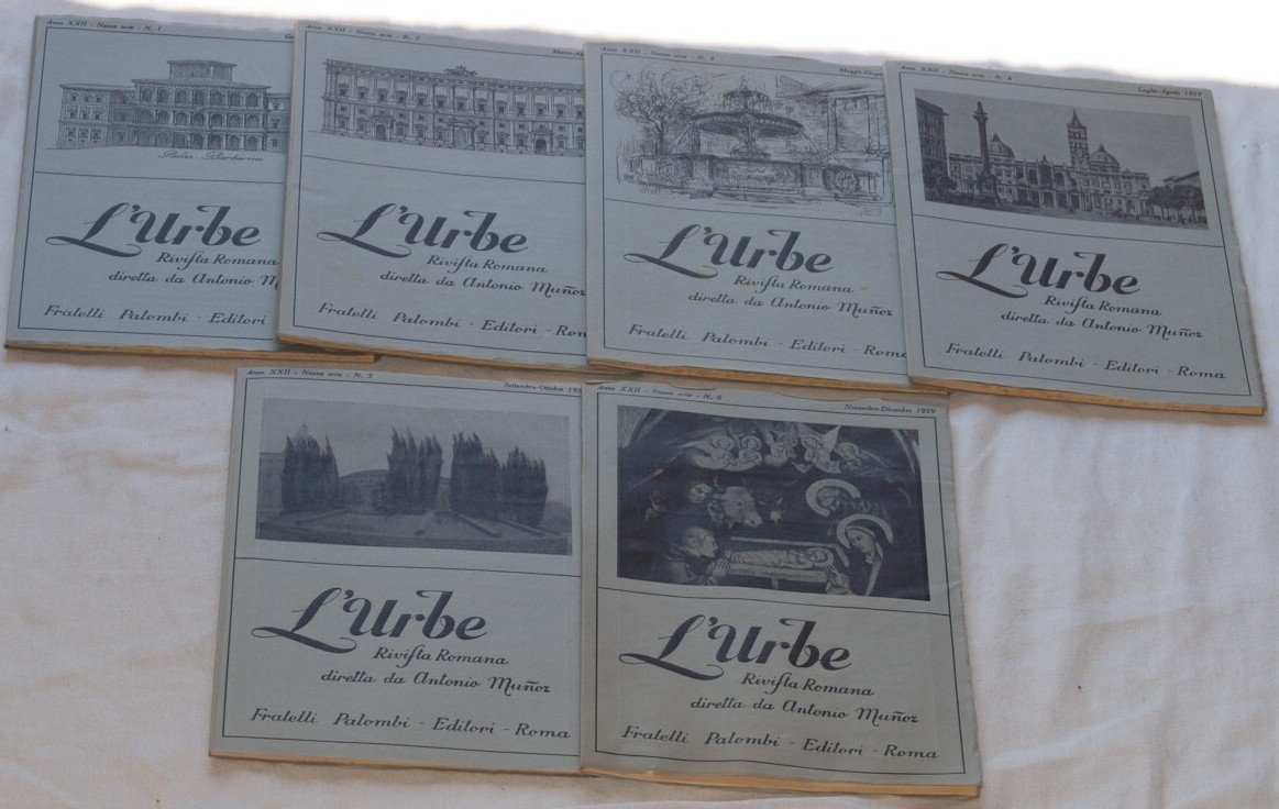 In 8. Dim. 26,5x19 cm. Pp. 40 cad. Rara annata del 1959 di questa rivista su Roma fondata nel 1936. La raccolta è formata da sei riviste ed è completa All'interno numerose foto, illustrazioni in bianco e nero e planches. Tra gli argomenti trattati: la Basilica Ostiense e due distici del Pascoli latino; la mostra di Michael Swerts e dei Bamboccianti; la caserma Cimarra in Roma; Barbara la bella romana; Ricordo di Giuseppe Bottai; Roma e i suoi bersaglieri; dai giardini di Nerone alle "Scholae Peregrinorum" e all'ospedale di S. Spirito; il "Paradiso" del Baciccia; san Cristogono in Trastevere; Vecchio Aventino; l'arte del settecento a Roma; Giuseppe Martellotti poeta romanesco; allarme per la bellezza di Roma; Strenna dei Romanisti 1959; Il parco della via Appia; Pro Villa Glori; Via San Francesco a Ripa; il Teatrino della cometa; "Bando delli libri proibiti" nella roma di Pio V; Leoni e la sua tomba al Verano; le bocchette degli armadi nelle sacrestie romane; Rosminia Roma; un infortunio del Cavalier Scaccia Presidente della insigne Accademia di S. Luca; le campagne archeologiche della Fondazione Lerici; la Scala Santa nella chiesa di San Giuseppe a Capo le Case; Ricordo di Cristina Teresa Palombi ecc. Belle brossure editoriali. In buone condizioni Brossura editoriale in buone condizioni generali con lievi usure ai margini e dorso. Legatura in buone condizioni. All'interno le pagine si presentano in ottime condizioni con rare fioriture. Scarce collection of 1959 of this magazine about Rome established in 1936. The collection ios made up of six magazines and it is complete. Inside different black and white photoes and illustrations in the text and out of the text . Among the issues treated: the Basilica Ostiense; the exibition of Michael Swerts and of Bamboccianti; the barracks Cimarra in Rome; Barbara the beautiful roman; Remembering of Giuseppe Bottai; Rome and his bersaglieri; from the gardens of Nerone until "Scholae Peregrinorum" and to the hospital of S. Spirito; the "Paradiso" of Baciccia; Saint Cristogono in Trastevere; Vecchio Aventino; the art of XVIII century in Rome; Giuseppe Martellotti roman poet; alarm for the beauty of Rome; Strenna of Romanists 1959; the park of via Appia; Pro Villa Glori; Via San Francesco a Ripa; il Teatrino della cometa; "Bando delli libri proibiti" in the Rome of Pio V; Leoni and his grave in Verano; Rosminia Roma; an accident of the Cavalier Scaccia President of the important academy of S. Luca; the archeological campaigns of the Fondazione Lerici; the Scala Santa in the church of SAint Giuseppe in Capo le Case; Remembering of Cristina Teresa Palombi ecc. Beautiful editorial covers. In good conditions. Editorial cover in good general conditions slightly worn in the edges and spine. Binding in good conditions. Inside pages are in very good conditions with occasional foxings.