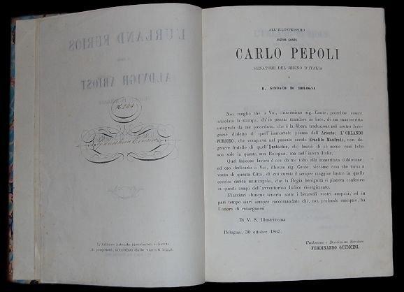 In 2° (28×20 cm); (12), 414, (2) pp. Bella ed elegante legatura coeva in mezza pelle con titolo e filettatura in oro al dorso. Piatti foderati con carta marmorizzata coeva blu. Ottimo stato di conservazione. Uno dei rari esemplari numerati e dedicati N°244 Sig. Zucchini C. Enrico. Dedicatoria al Conte Carlo Pepoli Senatore del Regno. Esemplare stampato su carta di ottima qualità. Testo su due colonne. Celebre edizione in dialetto bolognese dellOrlando Furioso del noto letterato e poeta dialettale bolognese Eraclito Manfredi, fratello del grande astronomo Eustachio. Eraclito, noto medico, fu dal 1731 lettore onorario di matematica nellUniversità di Bologna e dal 1739 vi lesse anche lezionin di idrometria. Ebbe interessi soprattutto naturalistico-chimici (tre lavori in De Bononiensi scientiarum et artium Instituto atque Academia Commentarii) e letterari sfociati proprio in questa celebre traduzione in bolognese Ariosto che venne pubblicata postuma nel 1865. Prima edizione in ottime condizioni di conservazione e in esemplare numerato con appartenenza a personaggio di nota famiglia nobile bolognese.