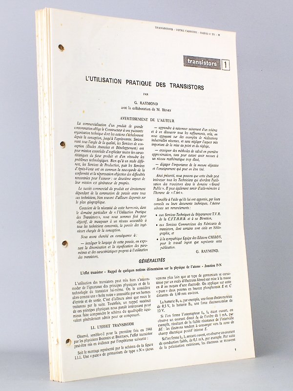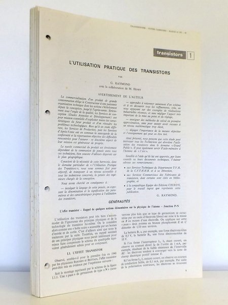 feuillets libres perforés, ill. couleur ou noir et blanc, " Votre carrière Radio et T.V. ", éditions Chiron, Paris, s. d. ( 1968 ), 118 pp. + 22 ff. pour la série "Flash d'initiation sur l'utilisation des transistors" Bon état. Prix pour l'ensemble. Liste des leçons : 1 Dioide à pointe ; [2] rappel de quelques notions fondamentales ; 3 caractéristiques statiques du transistor pour les montages basent commune et émetteur commun ; 4 commentaires sur l'utilisation des transistors en collecteur commun et conclusions ; 5 schémas équivalents et paramètres des transistors ; 6 caractéristiques limites du transistor en présence de signaux forts ; 7 stabilisations thermiques d'un étage à transistor ; 8 le transistor à haute fréquence en présence de signaux faibles ; 9 paramètres des transistors - unilatéralisation ou neutrodynage d'un étage HF à transistors ; 10 gain de puissance - facteur de bruit d'un transistor ; 11 le transistor en commutation (montage E) ; 12 les étages intermédiaires ; 13 les amplificateurs de puissance, exemple d'application ; 14 exemples d'amplificateurs à basse fréquence ; 15 amplification et changement de fréquence en VHF et UHF ; 16 l'oscillateur local ; 17 l'étage convertisseur de fréquence ; 18 réalisation d'un rotacteur à transistors ; 19 réglages du protecteur - réalisation d'un sélecteur UHF ; 20 sélecteurs UHF à transistor : réalisation, réglage, caractéristiques ; 21 les diodes VARICAP