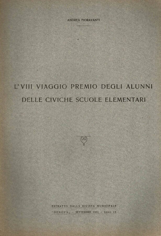 Sottile fascicolo spillato pubblicato in occasione dell'VIII viaggio premio degli alunni delle civiche scuole regionali come estratto della Rivista Municipale " Genova " nel settembre del 1931, la pubblicazione di 16 pagine in buono stato contiene il programma, il resoconto del viaggio con numerose fotografie in b.n. e la lista dei partecipanti, la copertina mostra lievi segni di ossidazione ai bordi.