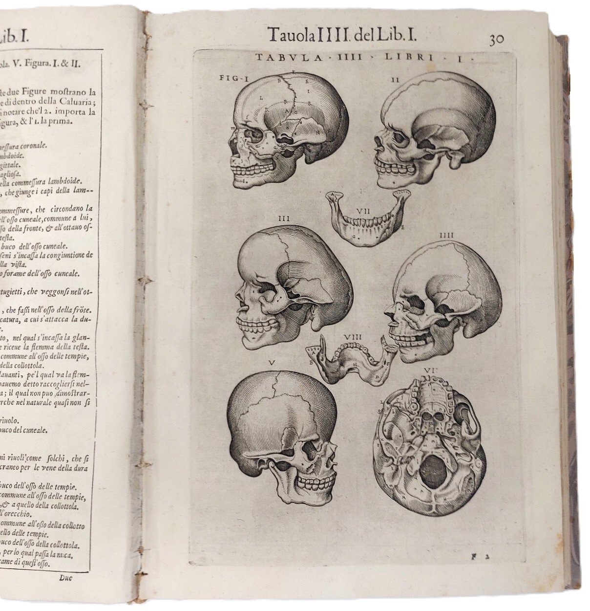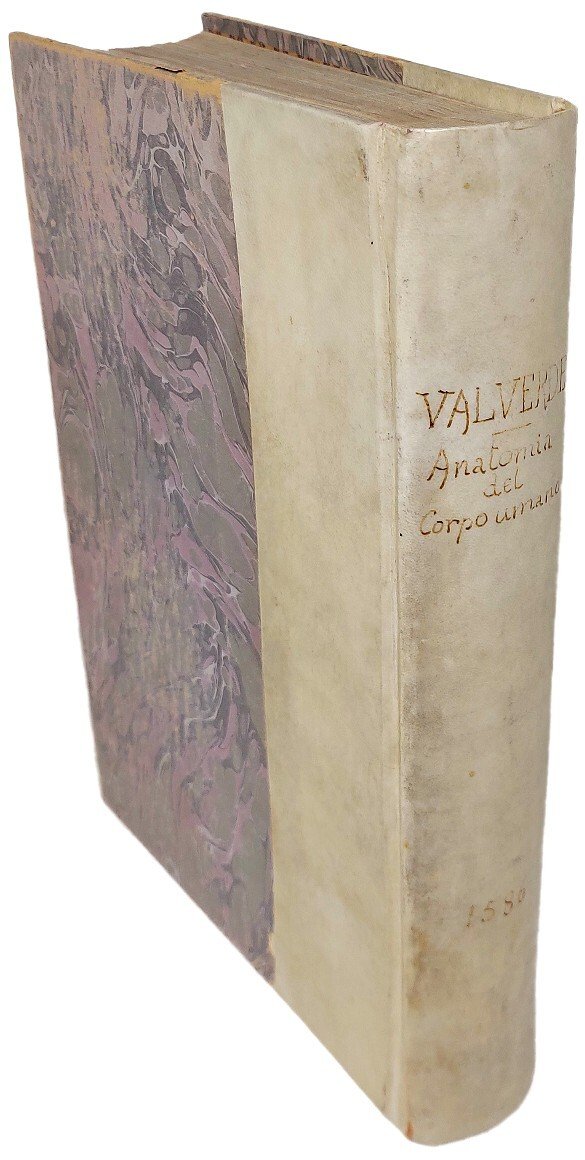 >in-folio, ff. (18), 154, leg. mod. m. perg., tit. ms. al dorso. Titolo inciso entro bella bordura a motivo architett. con particolari anatomici, ritr. dell'a. inc. da N. Béatrizet al verso della dedica al Re Filippo II (come nell'ediz. orig. in lingua spagnola pubblicata a Roma nel 1556); 46 tavole anatomiche a piena pag., 4 delle quali qui aggiunte fuori testo tra i ff. 82-83. Altra dedica al Card. fra Giovanni da Toledo. Le belle tavole si devono ai disegni di Gaspar Becerra ed al bulino di Nicolas Béatrizet o Beautrizet (Niccolò Beatrici, nato a Thionville); seppur basate su quelle di Vesalio, presentano vari miglioramenti ed addizioni. Seconda edizione della traduzione in lingua italiana (dopo la prima del 1560) di Anton Tabo (no Sabo, come talvolta si trova) e rivista dall'autore. E' l'opera maggiore di Valverde, il più stimato anatomista spagnolo del Cinquecento, il quale contribuì in maniera determinante alla diffusione delle teorie e dell'opera di Andrea Vesalio, medico belga e professore a Padova, che nel 1543 aveva pubblicato l'opera che avrebbe dato inizio allo studio moderno dell'anatomia. Esempl. discreto (lievemente rifilato, con qualche macchia gialla qua e là, tracce d'uso e annotazioni mss. al verso dei ff. 140 e 154). Camerini, Annali dei Giunti di Venezia, n. 911. Choulant pp. 205-08. Wellcome 6477. Waller I, n. 9806. Osler n. 576. Cushing-Fulton, pp. 146-7;: «...he corrected Vesalian anatomy. His eye-muscle figures are a great improvement on those of Vesalius, as is the representation of the muscles of nose and larynx». STC 711. Adams V-231.