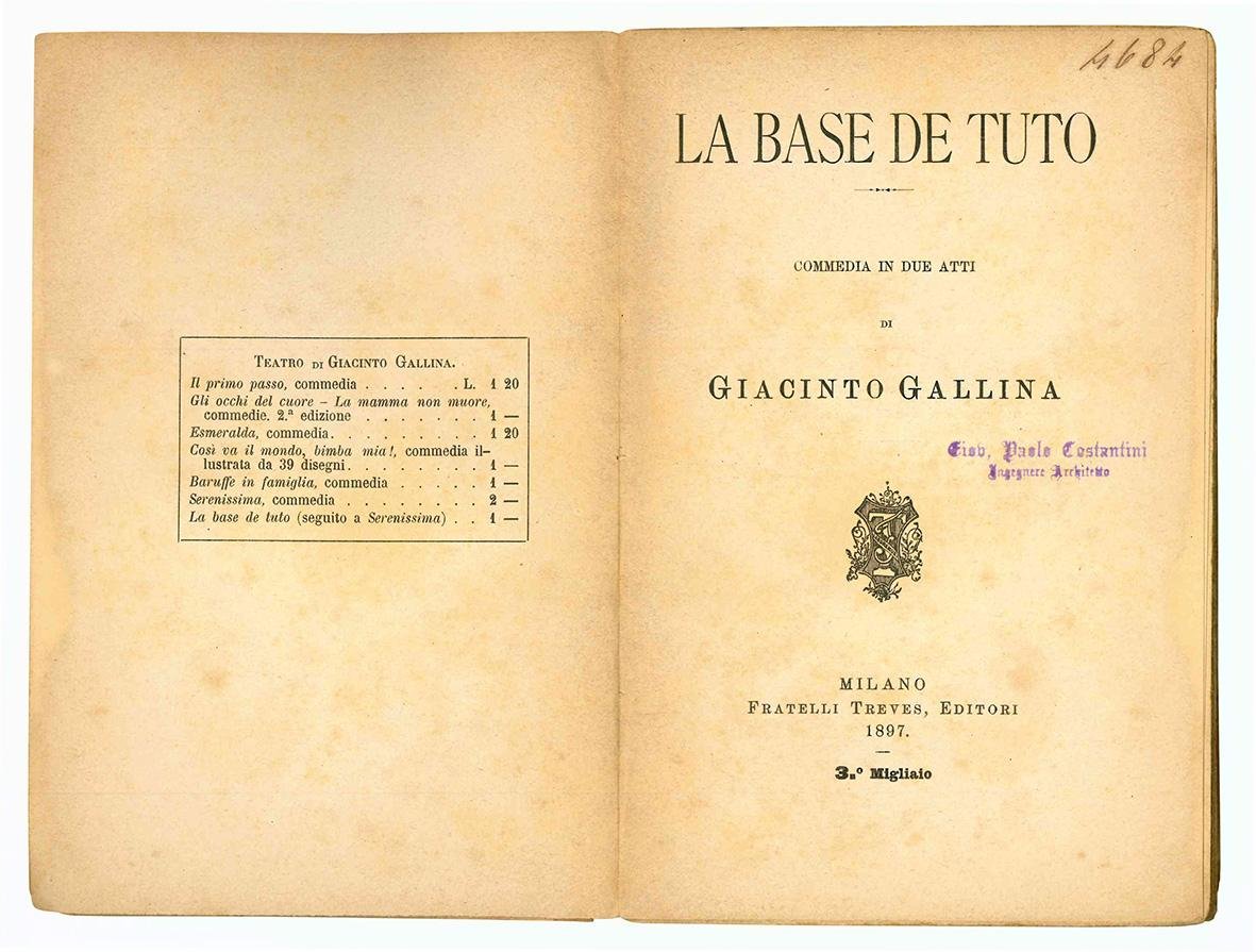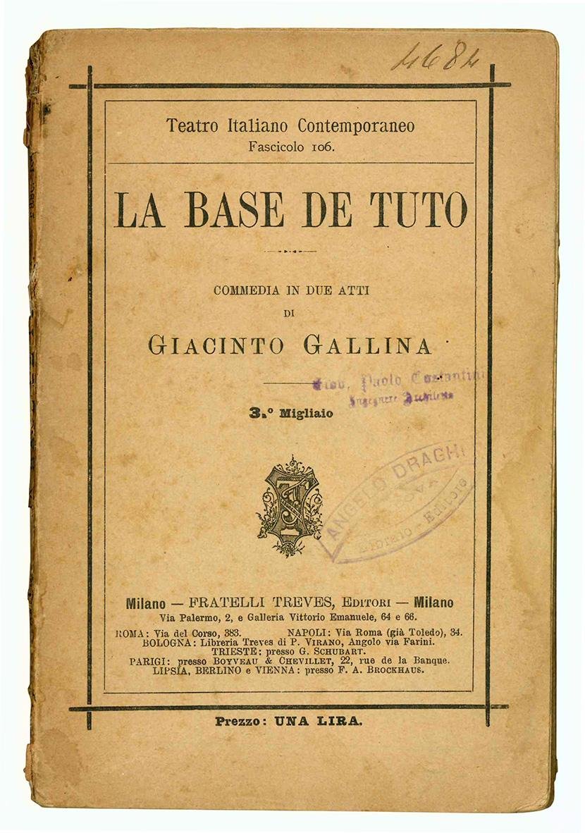 In 16mo (mm 192x127); pp. [4], 100, [16]. Lievi fioriture diffuse, carta leggermente ed uniformemente brunita. Brossura editoriale. Mancanze al dorso, lievi aloni e leggere fioriture alle copertine. Timbri di possesso alla copertina anteriore, all'occhietto e al frontespizio ("Giov. Paolo Costantini Ingegnere-Architetto" e "Angelo Draghi Libraio -Editore Padova"). Fa parte della collana: "Teatro Italiano Contemporaneo", fascicolo 106.