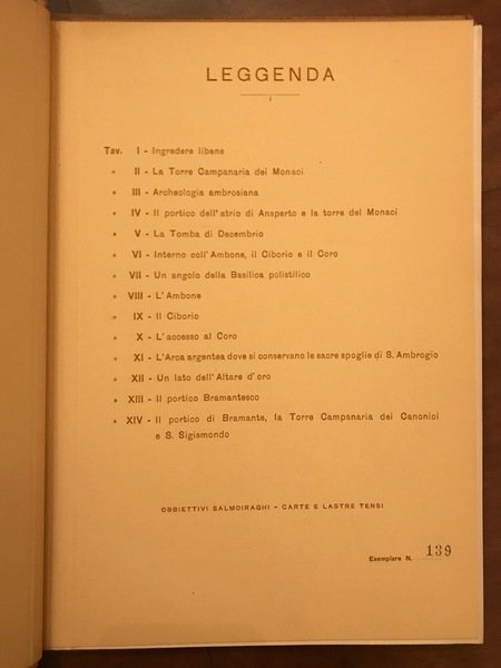 Tela ed., cm24.5x30.5, 1 carta di indice e XIV tavole in carta fotografica. Pubblicazione pubblicitaria degli obiettivi fotografici Salmoiraghi, con fotografie stampate su carte sensibili della ditta Tensi.