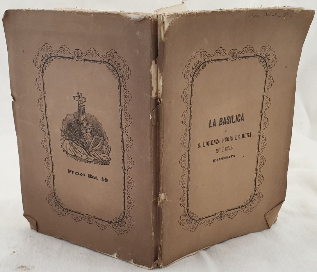 Edizione originale del 1861 di questa pubblicazione storica scritta da Salvatore da Morrovalle Cappuccino. L'opera è un saggio sull'origine e storia del Campo Verano a Roma con particolare riferimento alla Basilica di San Lorenzo fuori le Mura. Tra gli argomenti trattati: Arti e usi dei cristiani primitivi, Catacombe Laurenziane, San Lorenzo edificata per ordinee di Costantino Magno, I restauri di Pelagio, Portico, Interno della Chiesa, Sacrestia, Monastero ecc. Appendice di Tito Bollici sul Campo Santo. In buone condizioni. Copertina editoriale in discrete condizioni generali con usure e mancanze al dorso. Legatura in buone condizioni. Pagine in buone condizioni con rare fioriture. In 8. cm 20,5x14. Pp. 157+(2).Original edition of 1861 of this historical pamphlet written by Salvatore da Morrovalle Cappuccino. The work is an essay about the origin and history of Campo Verano in Rome with particular refeering to the Basilica di San Lorenzo fuori le Mura. The issues treated: Arts and usages of primitive christians, Catacombe Laurenziane, San Lorenzo edificata per ordinee di Costantino Magno, Restauration of Pelagio, Portico, Interno della Chiesa, Sacrestia, Monastero ecc. Appendix by Tito Bollici about cemetery. In good conditions. Editorial cover in fair conditions with wearings and tears in the spine. Binding in good conditions. Pages in good conditions with occasional foxing. In 8. cm 20,5x14. Pp. 157+(2).<BR><BR>