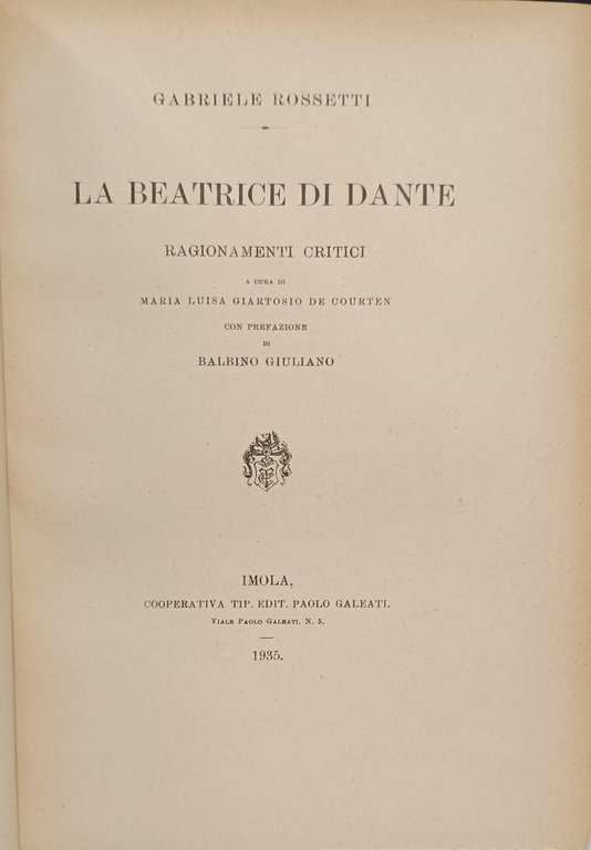 LA BEATRICE DI DANTE : RAGIONAMENTI CRITICI. - A cura di Maria Luisa Giartosio de Courten; con prefazione di Balbino Giuliano