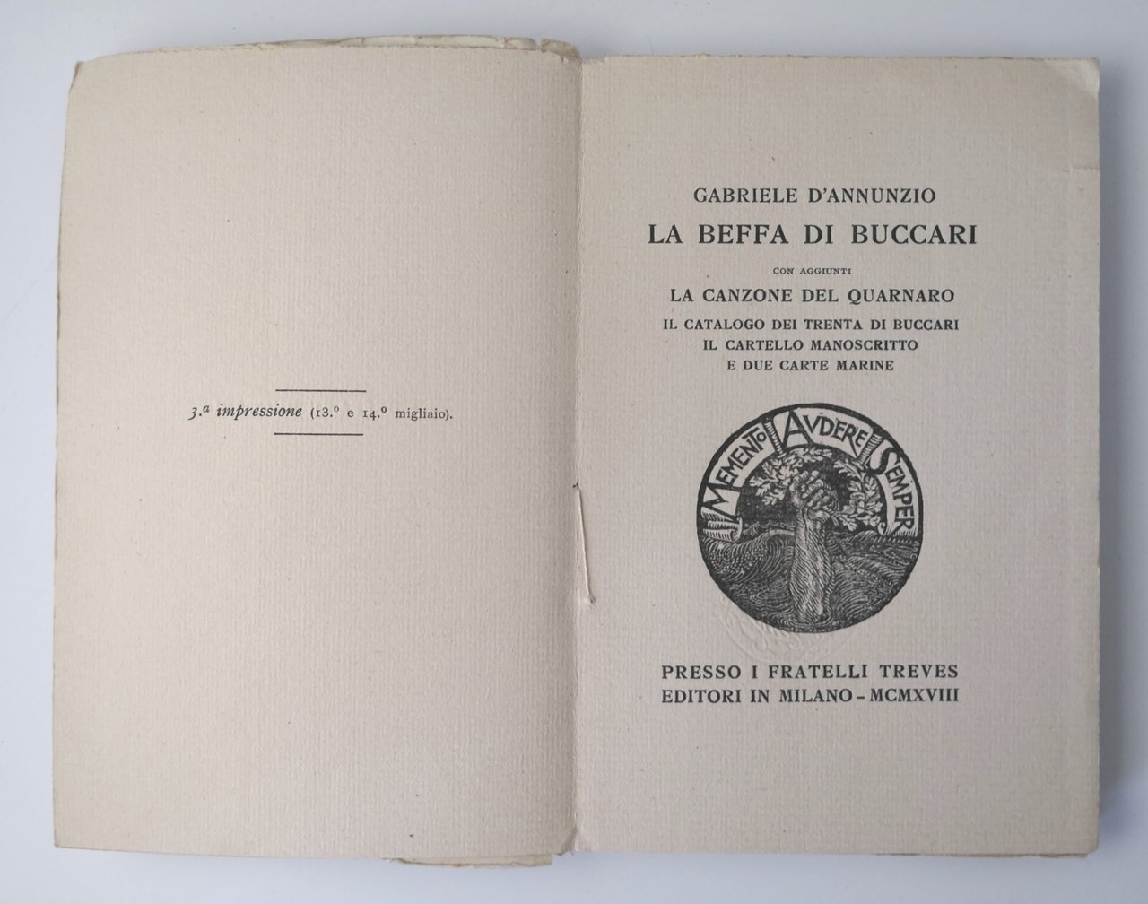 LA BEFFA DI BUCCARI Gabriele D'Annunzio 1923 Treves 3 edizione Libro Quarnaro