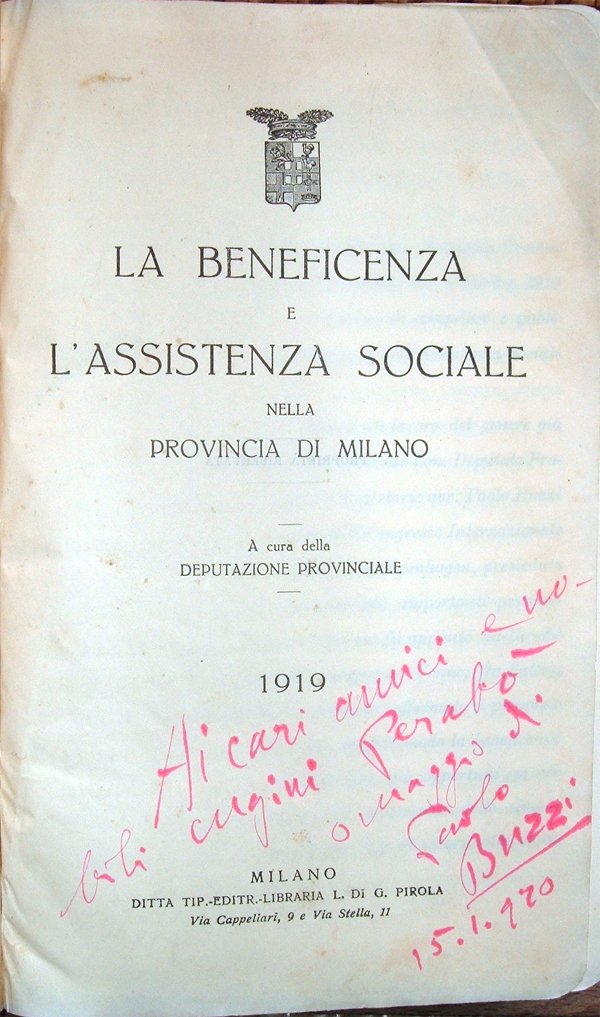 In-16° (19,5 x 12,5 cm), pp. VII, (1), 1431, (1), legatura editoriale semirigida, in tela, con normali segni del tempo, con titoli in oro al piatto anteriore e al dorso. Al frontespizio, invio autografo, firmato, di Paolo Buzzi, poeta, scrittore, drammaturgo, storiografo e giornalista, qui nella veste di segretario generale della Provincia di Milano. La dedica, a penna rossa, datata 15 gennaio 1920, recita: "Ai cari amici e nobili cugini Perabò omaggio di Paolo Buzzi". Piccoli segni d'umido ai tagli, per il resto ottimo esemplare. Preziosa e dettagliatissima opera che illustra la genesi, la configurazione giuridica e l'irradiazione delle diverse fondazioni di beneficenza e d'assistenza esistenti in quel periodo a Milano e provincia. Sono descritte, con dovizia di particolari, sotto il loro aspetto storico, economico e sociale, le Opere pie, le Congregazioni di carità, gli asili infantili, le scuole, i ricoveri, gli ospedali, i manicomi e tutte le altre istituzioni che si occupavano di assistenza sociale e di beneficenza. Paolo Buzzi nacque a Milano nel 1874. Conseguita la laurea in giurisprudenza, intraprese la carriera amministrativa e ricoprì la carica di Segretario generale della Provincia di Milano, occupandosi attivamente, in questo ufficio, dei molti problemi sociali del tempo, come ad esempio quello della pellagra. Dopo aver esordito con una poetica legata al classicismo carducciano e leopardiano, divenuto amico di Marinetti, fu tra i fondatori del Futurismo. La conoscenza della metrica e la passione per la musica lo stimolarono a una ricerca di libertà nell'espressione poetica, che lo condusse a realizzare il verso libero con le prime tavole parolibere. Accanto alla notevole produzione letteraria, degna di nota fu anche quella di carattere storiografico e celebrativo. Collaborò con numerose riviste e quotidiani, fra cui Italia futurista, La Sera, Il Popolo d'Italia, Il Resto del Carlino, Balza Futurista. Fu tra i fondatori di Roma futurista e del giornale Testa di ferro. Morì a Milano nel 1956. Indice del volume: Parte I. Capitolo I. Beneficenza Provinciale. I. Assistenza agli alienati; II. Assistenza agli esposti; III. Opere Pie Provinciali; IV. Sussidi a Scuole ed Istituzioni diverse; V. Provvidenze agrarie, profilattiche e igieniche-sociali; VI. Diarie nei Sanatori per tubercolosi; VII. Decentramento Ospitaliero; VIII. Riassunto. Capitolo II. Istituzioni che hanno sede in Milano, ma che estendono la loro beneficenza a tutti gli abitanti della Provincia. I. Assistenza sanitaria. Ospedali ed Istituti per cure speciali; Istituzioni sanitarie; Cure balnearie, climatiche e diverse; II. Assistenza all'infanzia e all'adolescenza. Orfanotrofi e ricoveri diversi; Istituti e Patronati per minorenni abbandonati, maltrattati e delinquenti; Pensionati. III. Assistenza agli orfani di guerra; IV. Istruzione ed educazione. Sussidi ad Asili infantili; Posti gratuiti e semigratuiti presso determinati istituti; Borse ed assegni di studio per determinate scuole; Borse per studi di perfezionamento; Borse ed assegni di studio a discendenti di determinate famiglie; Concorsi a premi diversi; Scuole professionali e diverse; V. Assistenza agli inabili. Ricoveri per vecchi; Assistenza a sordomuti, ciechi, deficienti, ecc.; Assistenza ad invalidi di guerra; VI. Beneficenza elemosiniera e dotale. Elemosiniera; Dotale; Istituzioni elemosiniere e dotali in favore di determinati Comuni le quali hanno l'amministrazione in Milano; VII. Istituti di previdenza e sociali; VIII. Riassunto. Capitolo III. Istituzioni che hanno sede in altri Comuni, ma alle quali è possibile rivolgersi per determinati bisogni. I. Assistenza all'infanzia e all'adolescenza; II. Istruzione ed educazione. Convitti Nazionali; Educandati; III. Assistenza agli inabili; Capitolo IV. Comuni della Provincia di Milano costituenti il Ducato di Milano secondo il riparto territoriale dell'anno 1757; Capitolo VI. Elenco delle Parrocchie della Provincia di Milano che fanno parte della Diocesi di Milano; Capitolo VII. Elenco dei Comuni della Provincia divisi per Circondari e Mandamenti amministrativi. Parte II. La Beneficenza, l'Assistenza e la Previdenza negli altri Comuni della Provincia. Parte III. Indici. I. Elenco delle Istituzioni, Opere Pie, ecc., descritte o accennate nel volume; II. Elenco dei Comuni, frazioni, cascine, luoghi menzionati nel volume; III. Indice sistematico. Errata-Corrige.