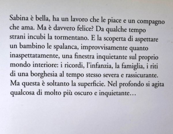 Sabina è bella, ha un lavoro che le piace e un compagno che ama. Ma è davvero felice? Da qualche tempo strani incubi la tormentano. E la scoperta di aspettare un bambino le spalanca, improvvisamente quanto inaspettatamente, una finestra inquietante sul proprio mondo interiore: i ricordi, l'infanzia, la famiglia, i riti di una borghesia al tempo stesso severa e rassicurante. Ma questa è soltanto la superficie. Nel profondo si agita qualcosa di molto più oscuro e inquietante.
