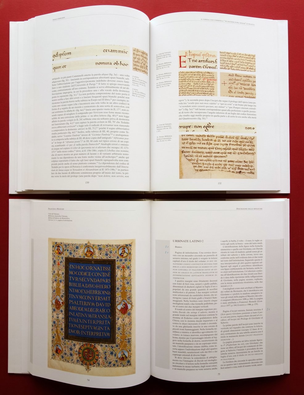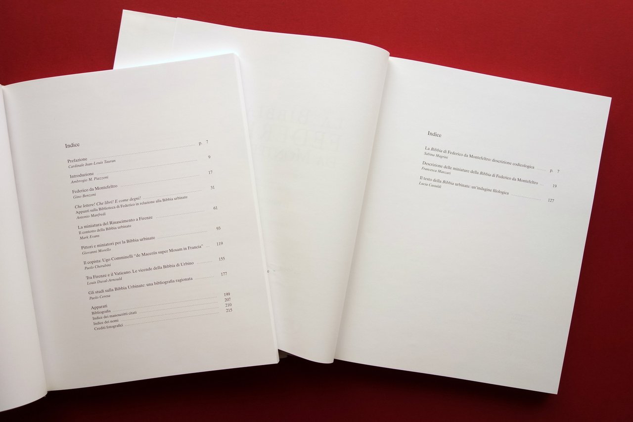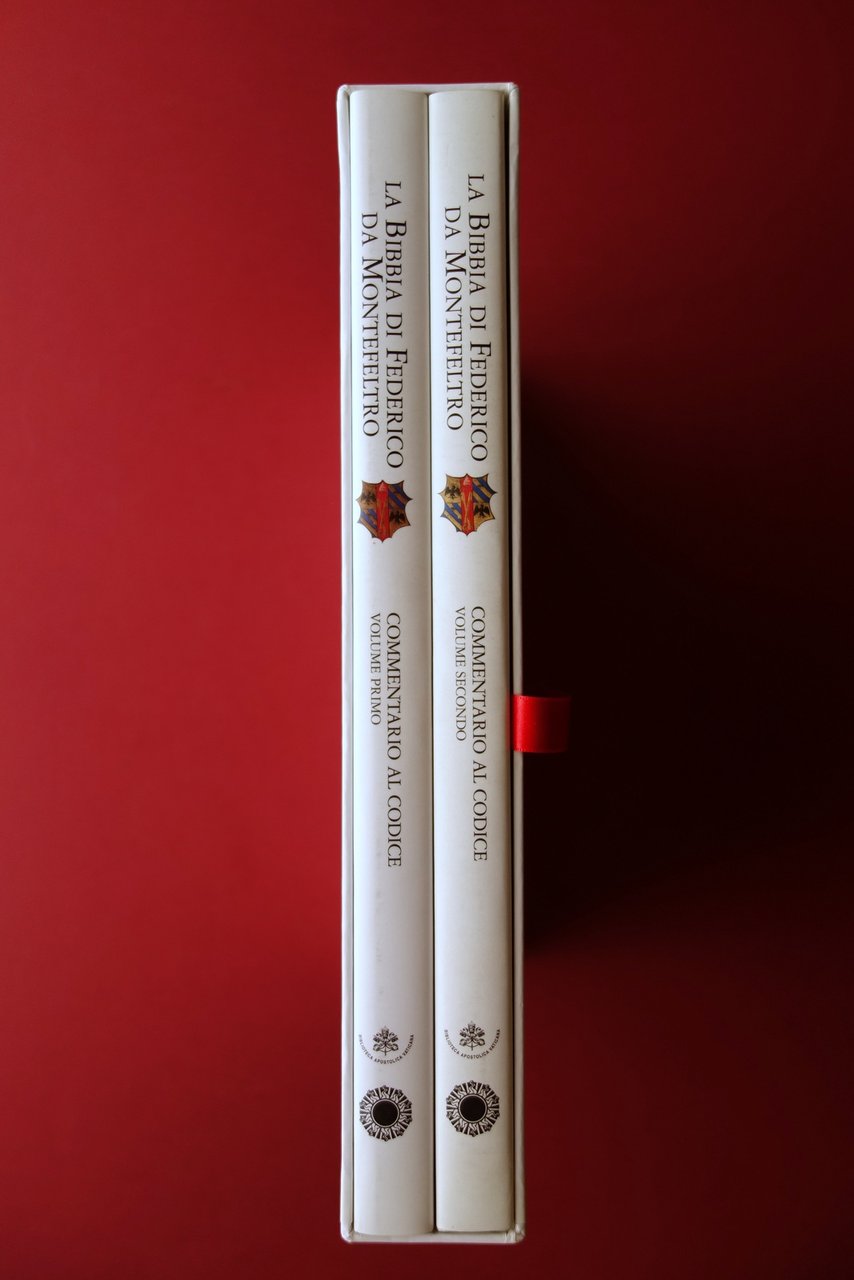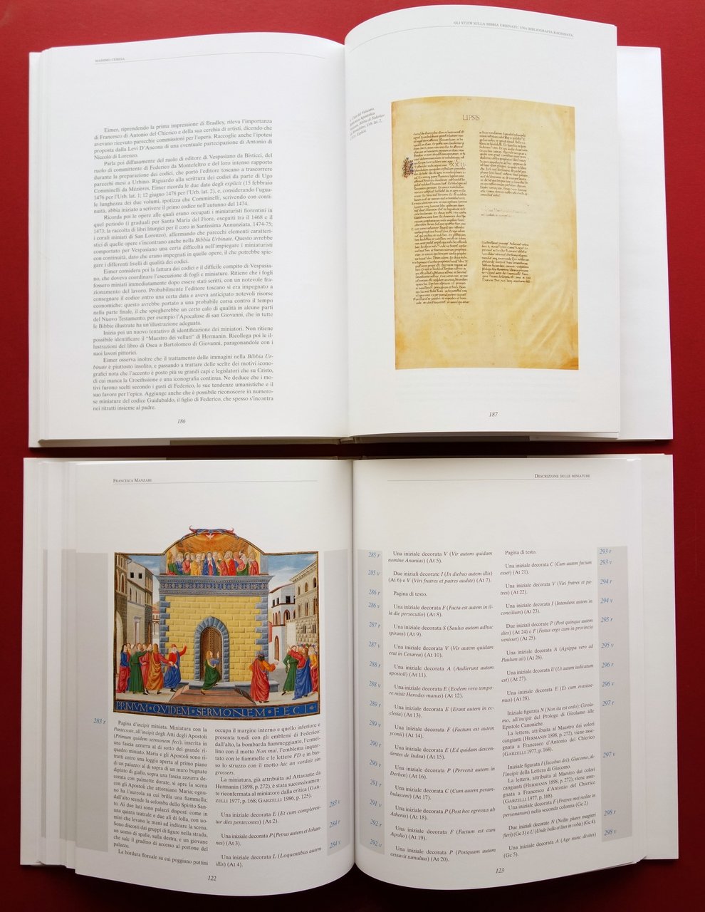 AA. VV., La Bibbia di Federico da Montefeltro Codici Urbinati Latini 1-2 / Biblioteca Apostolica Vaticana Commentario a cura di Ambrogio M. Piazzoni volume primo - secondo (opera completa in due volumi) Franco Cosimo Panini, Modena 2005; cm 31,5x24,5; pp. 216 (vol. primo); pp. 208 (vol. secondo), entrambi con numerose belle ill. a colori nel t. e fuori t.; tutta tela ed. con titolo al dorso, sovraccoperta ed. ill. a colori. Opera completa in due volumi inseriti entro cofanetto ed. in cartonato ill. a colori. Condizioni di conservazione Esemplare in ottime condizioni. Interni anch'essi ottimi, freschi. Opera completa in due volumi Ottimo stato di conservazione. SETT210.L19456 N