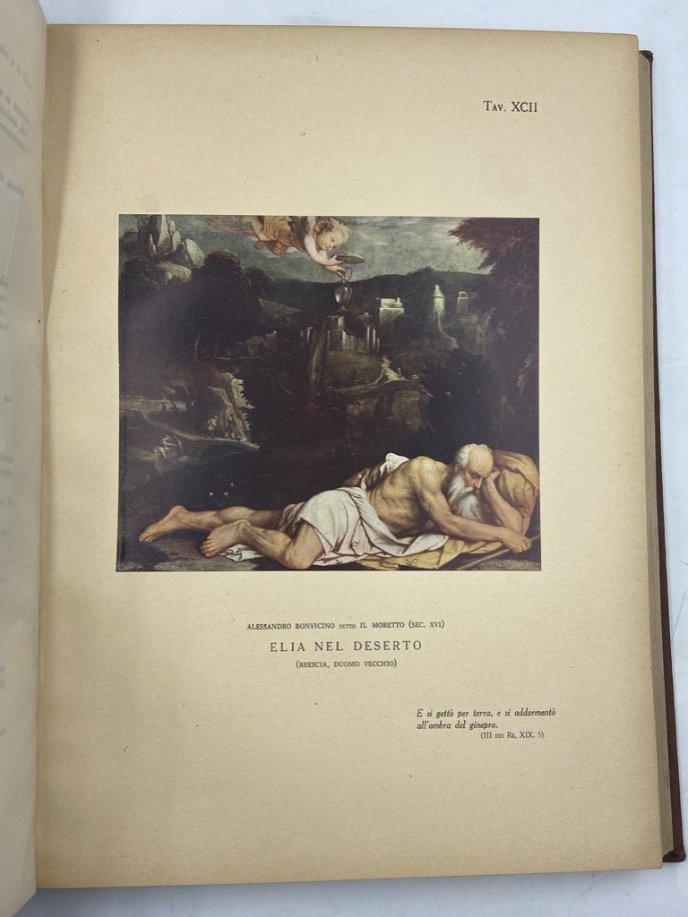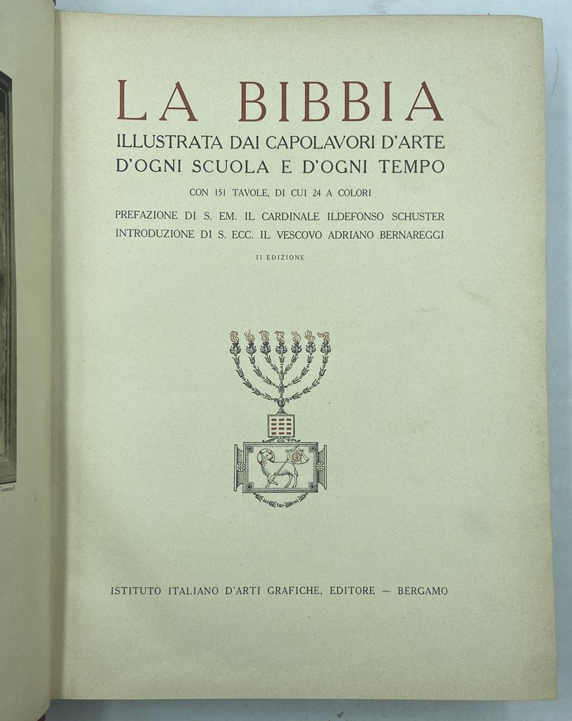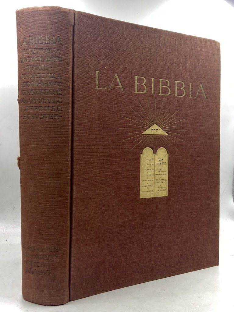 Tela editoriale color mattone con titoli dorati sul dorso e piatto anteriore e fregi applicati sul piatto anteriore (tavole della legge, tetragramma entro triangolo), taglio superiore dorato, cm 35 x 25, pp XXIV 398 (2), 151 tavole, di cui 24 a colori, protette da velina. Difetto (piccola mancanza di tela) lungo il canalino posteriore, internamente ben conservato. Seconda edizione di questa imponente Bibbia commentata e illustrata da riproduzioni di dipinti, incisioni e miniature; il volume, di fatto un’estesa antologia di brani biblici scelti e commentati da Mons. Francesco Vistalli, ha prefazione del Cardinale Ildefonso Schuster, e introduzione del Vescovo Adriano Bernareggi. La prima edizione dell’opera risale al 1933.