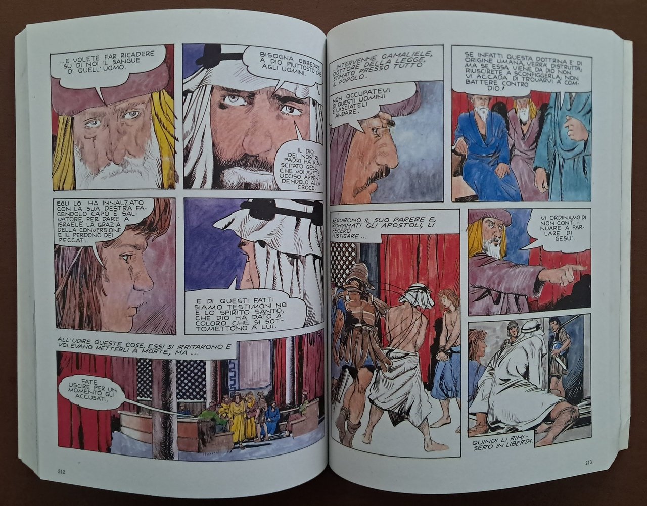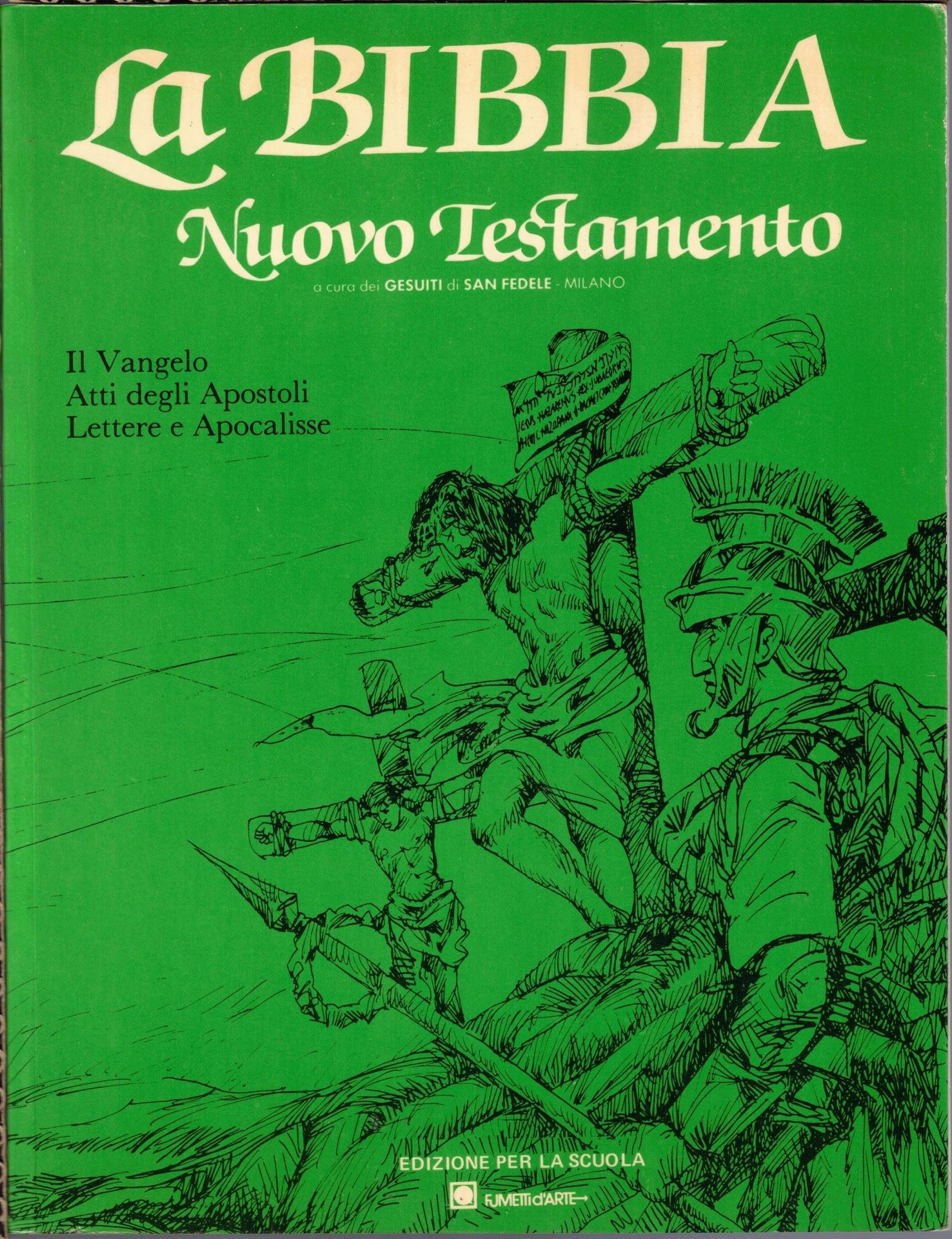 La Bibbia. Nuovo Testamento. Il Vangelo Atti degli Apostoli Lettere e Apocalisse, a cura dei Gesuiti di San Fedele – Milano, realizzazione di Pietro Vanetti, Fumetti d’Arte, s.l. (ma diffusione Minerva, Casalmaggiore) 1985-1987, pp. 384, ill. col., cm 25, br. ed. Nuovo testamento a fumetti. Descrizione effettuata sulla base della prima di copertina. In calce al frontespizio: Edizione per la scuola. Sceneggiatura di Remo Pizzardi. Illustrazioni di Tullio Brunone. Volume stampato su carta riciclata. Leggere tracce d’uso, per il resto ben conservato.