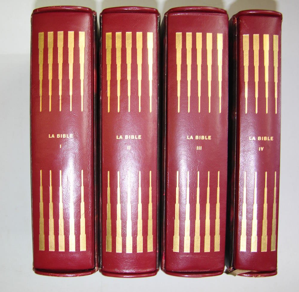 Editions Paris, Bievres - Pierre de Tartas, 1973. Quatre volumes in/4 (25 x 20 cm) reliure éditeur d'après la maquette de Vasarely pleine basane rouge à décor doré, doré sur tête, sous étui cartonné (abîmés), illustrations originales en couleurs de Bernard Buffet, Jean Commére, Marcel Delmotte, Léonard Foujita, Jacques Villon, P.-Y. Tremois, Pablo Picasso, Steinlen, Michel Ciry . Tome I : 600 pages Tome II : 558 pages Tome III : 608 pages et Tome IV : 416 pages. Benoit, Pierre, O.p. Professeur Panagiotis Bratsiotis - Georges Casalis - Rabbin André Zaoui - Richard Dupuy Grand Maître de la Grande Loge de France.