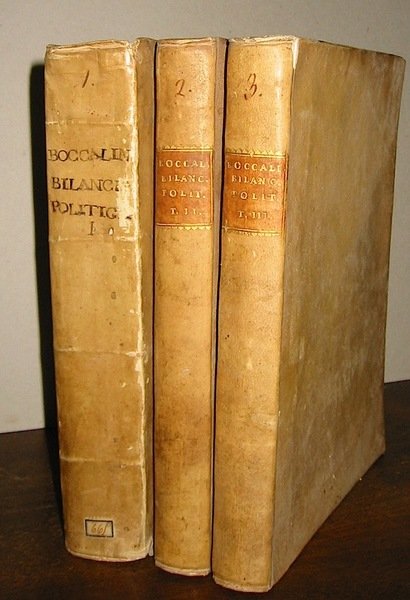 4to (cm. 24,2), 3 Voll., 9 cc.nn. compresa una carta bianca e la bella antiporta incisa su rame, 20 pp.nn. (Indice, qui legato all’inizio del Vol.), 508 pp.; 12 cc.nn., 472 (recte 272) pp., 48 pp.; 20 cc.nn., 319(1) pp. Legature coeve in piena pergamena non omogenee. Il primo vol. con nervi e titolo ms. al ds. (piccole mancanze ai margini dei piatti). Il secondo e terzo con titolo su tassello dipinto e ds. liscio. Edizione originale pubblicata postuma.