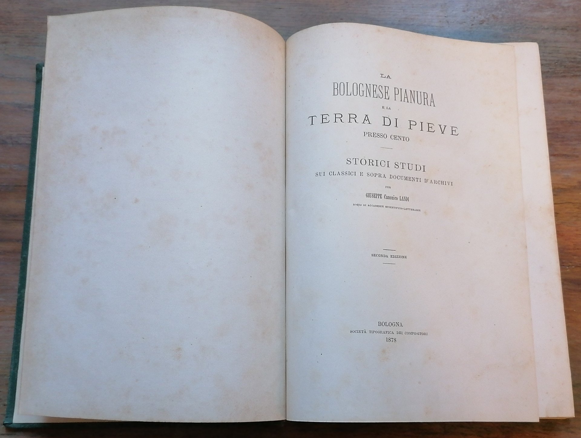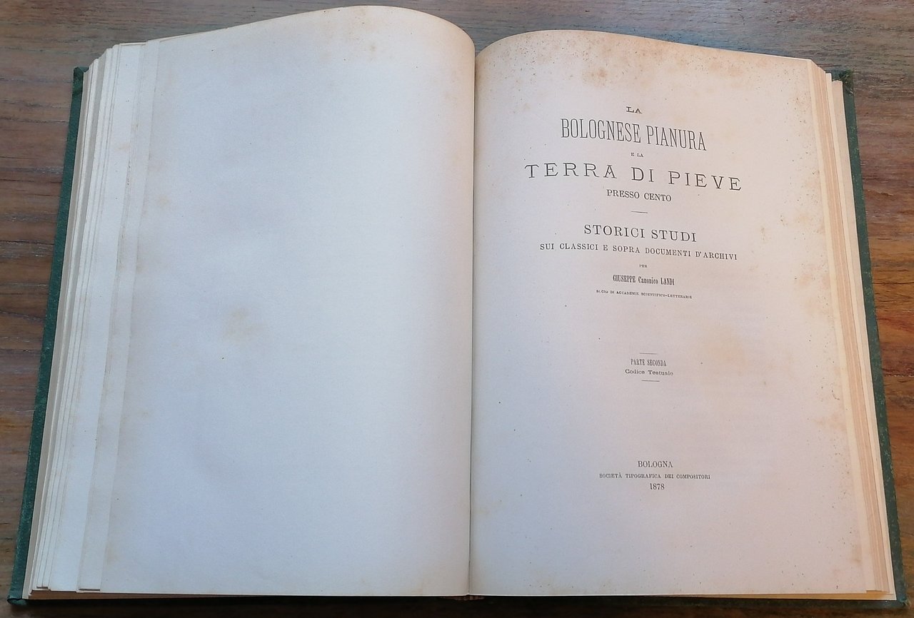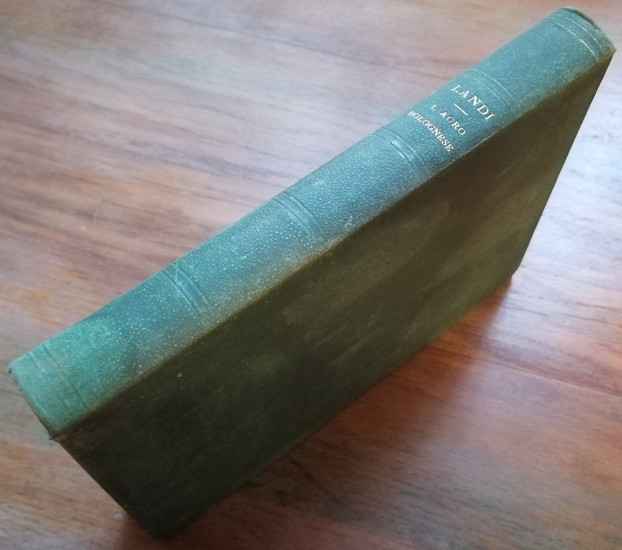 Due parti riunite in un volume in 8° grande (cm 27 x 19,5), legatura coeva in piena tela, al dorso titoli in oro (Landi "L'agro bolognese"), pp. 373,(1) ; (2),107,(1). La seconda parte contiene il "Codice testuale, ossia serie cronologica de' documenti". Seconda edizione. Segni del tempo alla legatura, peraltro volume in ottimo stato di conservazione. Dedica autografa per dono dell'autore al recto del foglio di guardia anteriore.