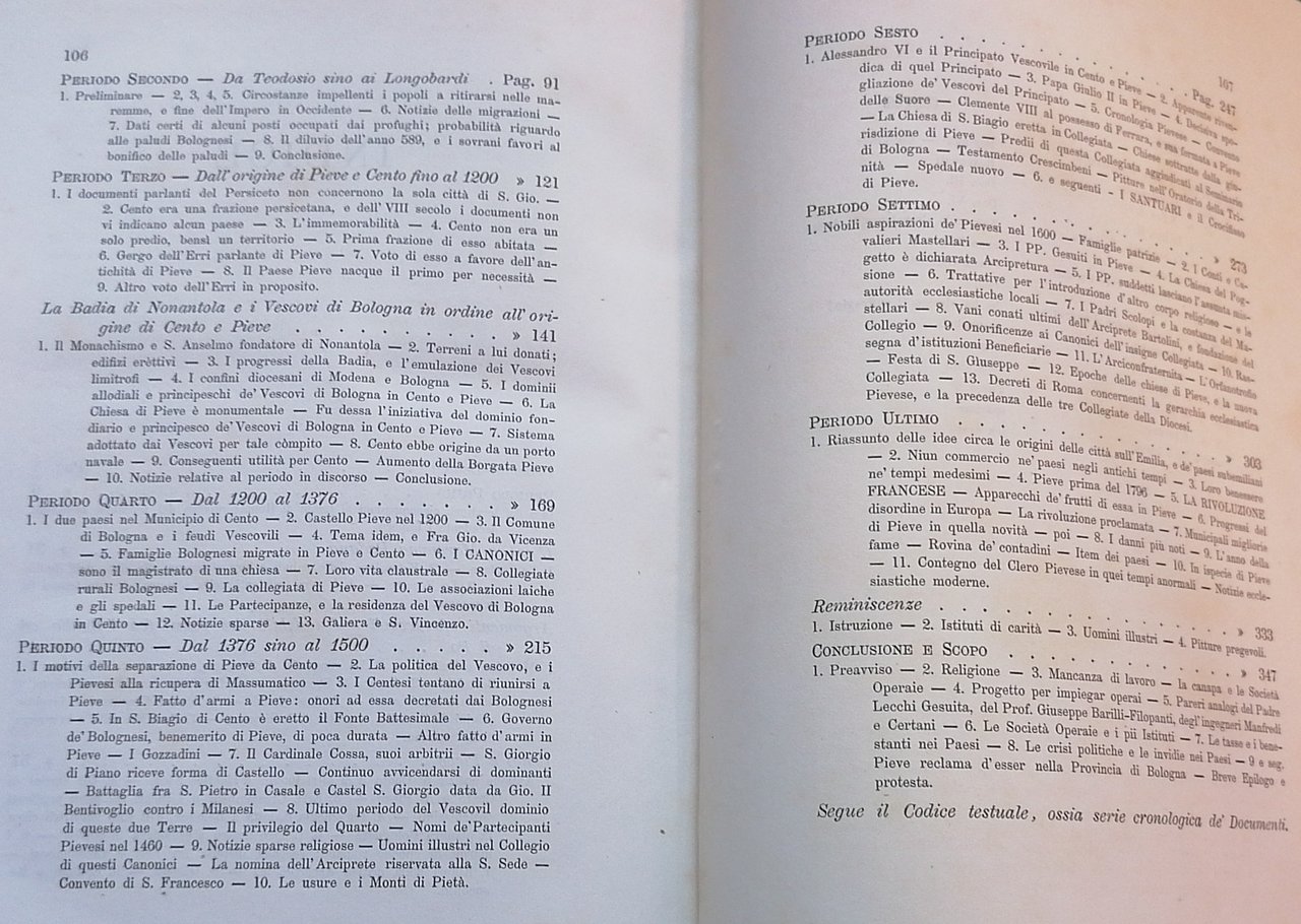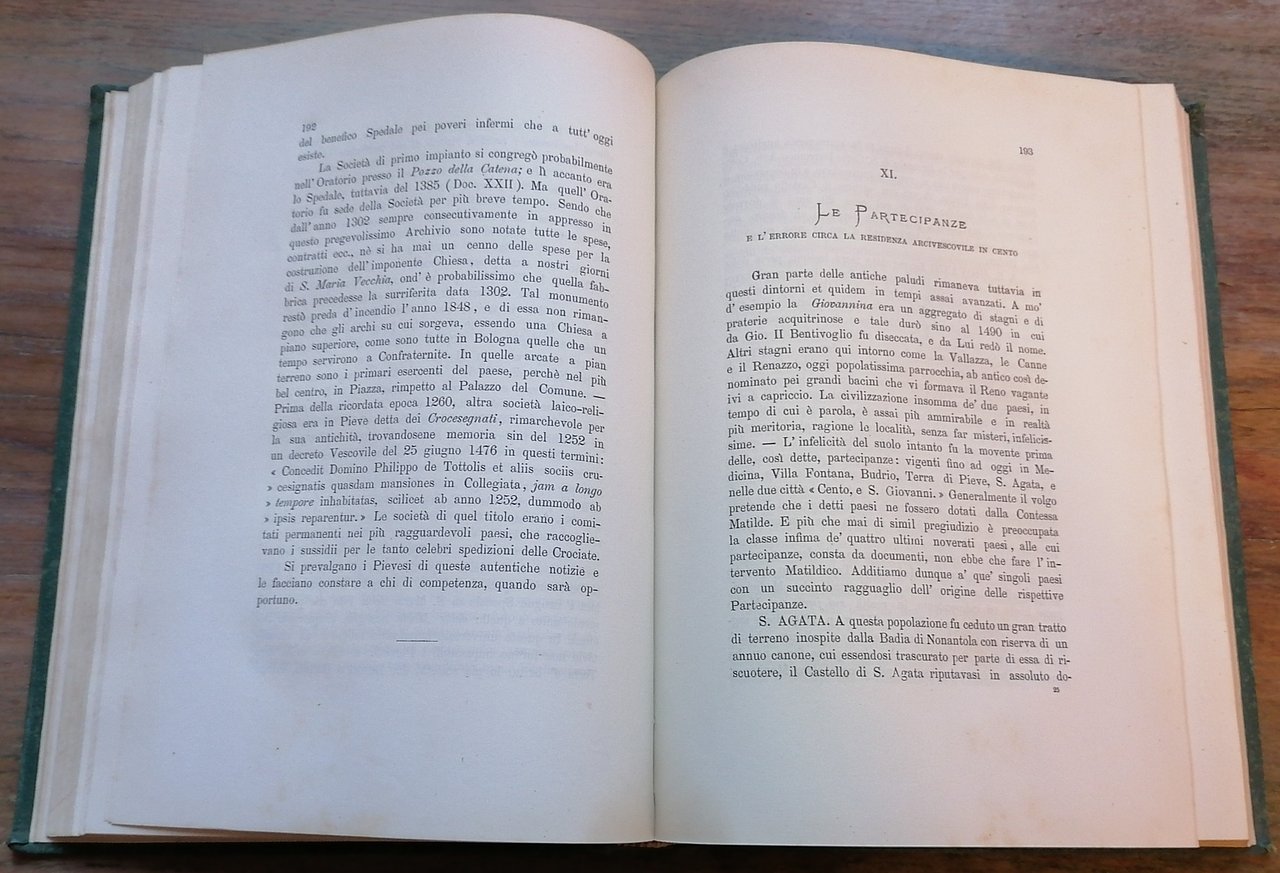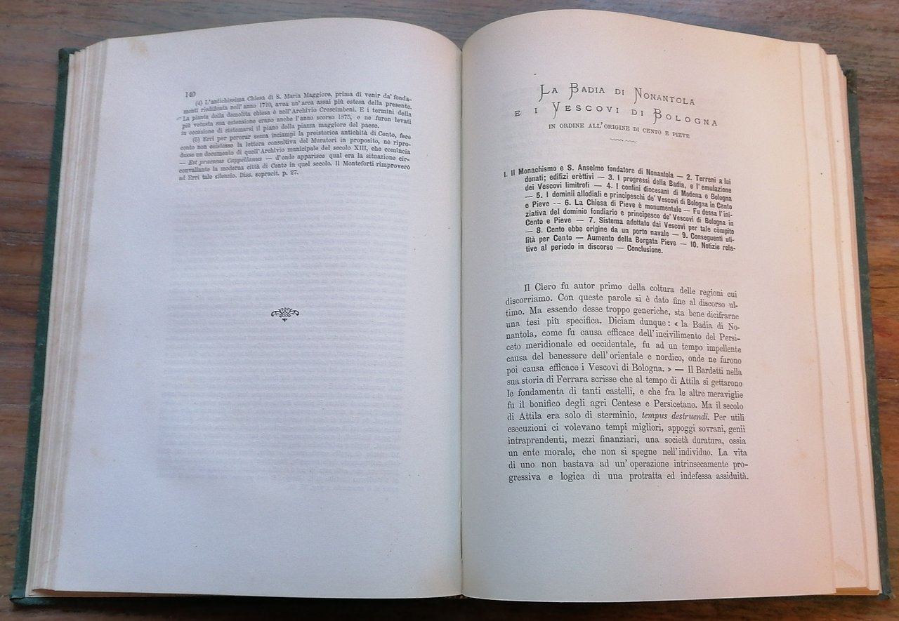 Due parti riunite in un volume in 8° grande (cm 27 x 19,5), legatura coeva in piena tela, al dorso titoli in oro (Landi "L'agro bolognese"), pp. 373,(1) ; (2),107,(1). La seconda parte contiene il "Codice testuale, ossia serie cronologica de' documenti". Seconda edizione. Segni del tempo alla legatura, peraltro volume in ottimo stato di conservazione. Dedica autografa per dono dell'autore al recto del foglio di guardia anteriore.