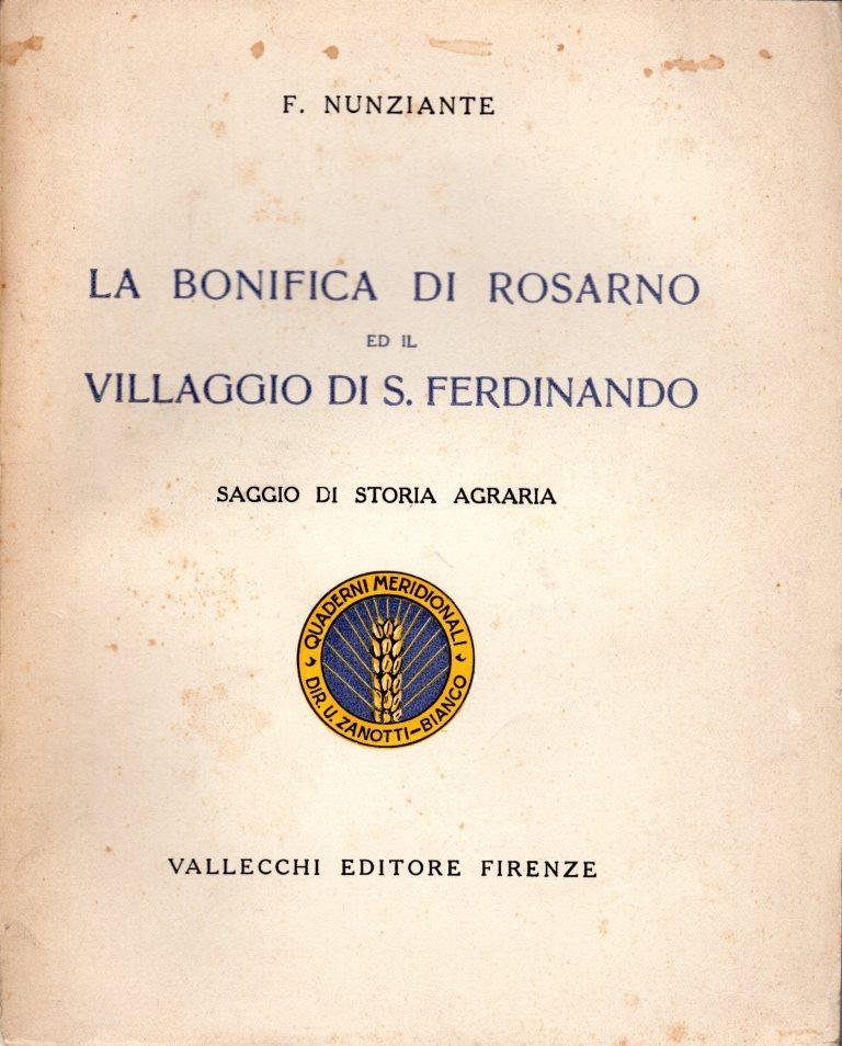 La bonifica di Rosarno ed il villaggio di S. Ferdinando, prima edizione 1929, pp. 93, formato 16 x 20.<BR>Copertina morbida di colore beige con titoli in nero e blu al piatto anteriore e in nero sul dorso. All'interno numerose tavole fotografiche in b/n. Volume intonso. <BR>Piccole fioriture ai piatti. Ingiallimento delle pagine dovuto al tempo. Nel complesso condizioni molto buone.