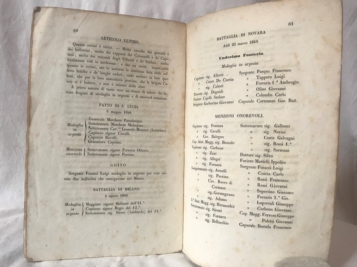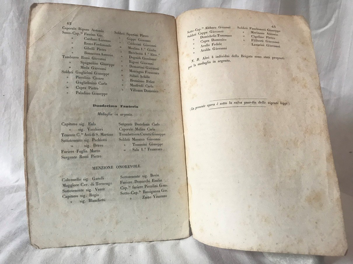 Opuscolo in 8, brossura editoriale, titolo al piatto, frontespizio con vignetta incisa, prefazione dell'autore, 63 pp. Un accurata e precisa esposizione dei fatti dall'importante contenuto storico, dedicata alla memoria dei Generali Barone Perrone e Marchese Passalacqua. Leggera fioritura della carta, rare mende. In bello stato, raro.