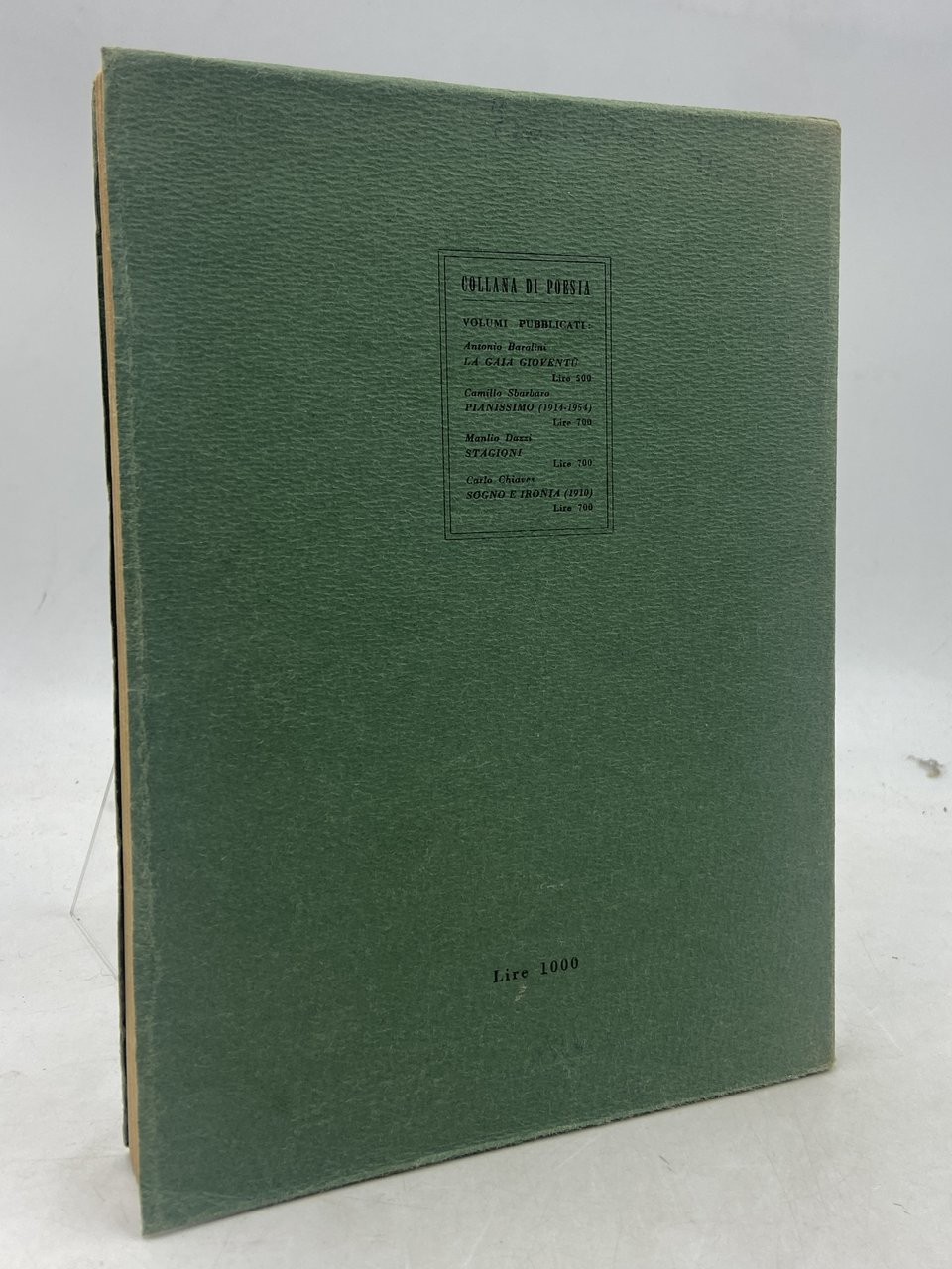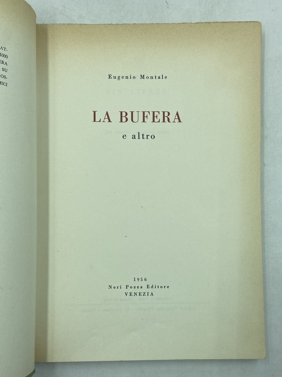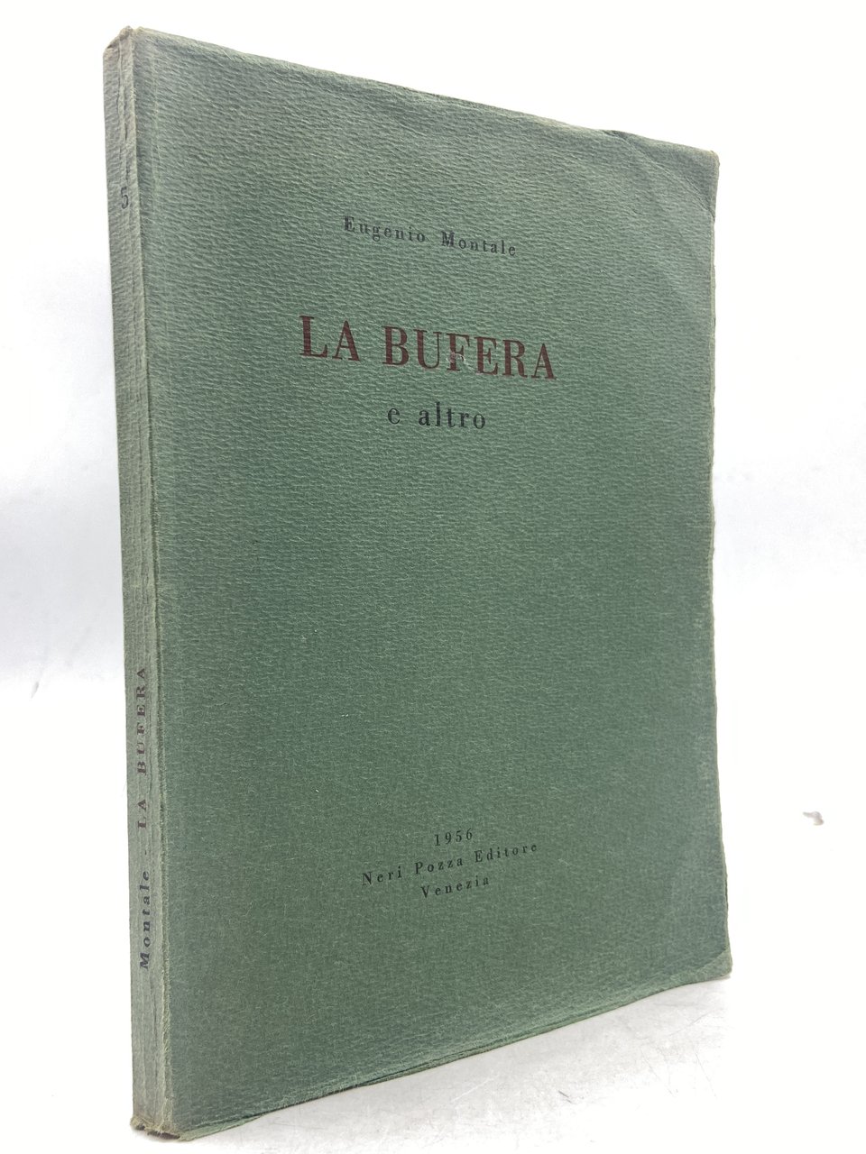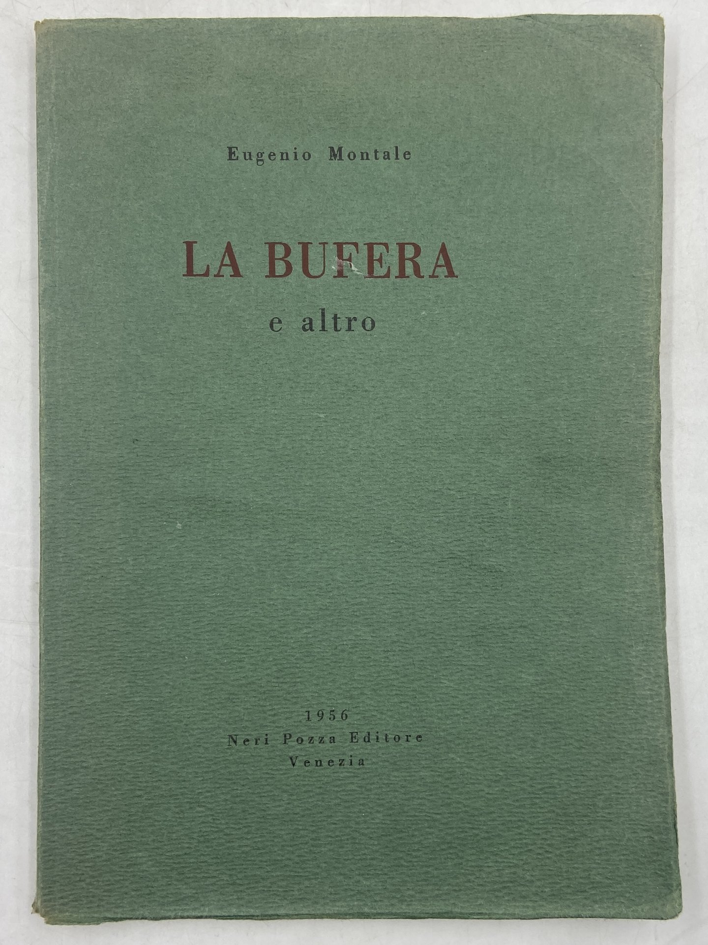 Brossura editoriale a stampa, cm 21 x 15, pp 139 (3). Buono stato, leggeri segni d’uso sulla coperta. Edizione originale, impressa a Vicenza il 15 giugno 1956 dall’Officina Tipografica Vicentina; questo uno dei 1000 esemplari non numerati della tiratura ordinaria, affiancata da una serie di 100 copie numerate fuori commercio. Terza raccolta poetica di Montale, il cui titolo inizialmente previsto era Romanzo 1940-1954; raccoglie poesie composte dall'autore dopo Le Occasioni e comprende i versi di Finisterre e altre sillogi già apparse autonomamente o su periodici, oltre a 5 poesie inedite. Premio Marzotto 1956. Gambetti Vezzosi, p. 552; Spaducci, p. 186.