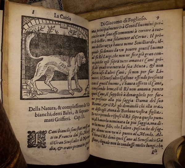 In-8 (15 cm) (8) 338 (6). Stemma xilografato del dedicatario Ercole Visconti, signore di Pagazzano al frontespizio. 40 xilografie nel testo, spesso ripetute.Legatura in piena pergamena settecentesca, sguardie moderne, tagli colorati. Margini piuttosto ridotti. Piccolo foro alla pagine 273 Prima edizione italiana dell'importante trattato sulla caccia col cane di Jacques Du Fouilloux (1521-1580), stampato per la prima volta a Poitiers nel 1560, sebbene la presente traduzione ricalchi la edizione parigina del 1606. Questo assai celebre testo cinquecentesco dedica tutta una prima parte alla descrizione e cura dei cani, per poi rivolgersi alla esamina della caccia al cervo, al cinghiale, alla lepre, alla volpe ed ai tassi; il volume si chiude con alcune ritcette di veterinaria. (EN) In-8 (15 cm) (8) 338 (6). Woodcut coat of arms of the dedicatee Ercole Visconti, lord of Pagazzano on the frontispiece. 40 woodcuts in the text, often repeated. Full eighteenth-century parchment binding, modern endcaps, colored cuts. Rather small margins. First Italian edition of the important treatise on hunting with dogs by Jacques Du Fouilloux (1521-1580), printed for the first time in Poitiers in 1560, although the present translation follows the Parisian edition of 1606. This very famous sixteenth-century text dedicates an entire first part to the description and care of dogs, and then to examine the hunting of deer, wild boar, hare, fox and badgers; the volume ends with some veterinary recipes.