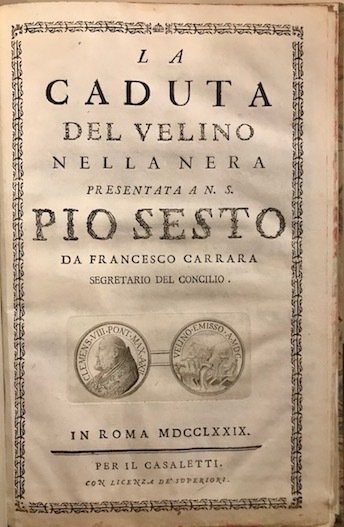 4to (cm. 28), XXIV pp. Frontespizio entro cornice tipografica con vignetta calcografica raffigurante papa Clemente VIII. Due grandi illustrazioni n.t. ed una tav. ripiegata in fine. Legatura recente con ds. in carta pergamenata e piatti marmorizzati. Tagli rossi. Ottimo esemplare, assai fresco. Dettagliata descrizione storico-topografica della Cascata delle Marmore. Lozzi, 5828.