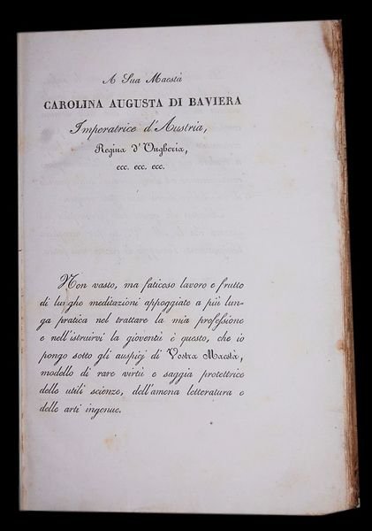 In 4° piccolo (23,5×16 cm); (2), XXXII, 436, (2) pp. e 3 c. di tav. (compreso il frontespizio inciso da Prada. Legatura coeva in pieno cartoncino con titolo e autore impressi in nero al dorso. Esemplare in buone condizioni di conservazione ed ancora in barbe. Prima ed unica edizione di questa celebre opere dedicata alla calcografia e alle tecniche incisorie scritto dal celebre pittore ed incisore originario di Monza, Giuseppe Longhi (Monza, 13 ottobre 1766 Milano, 2 gennaio 1831). Lautore fece in tempo a pubblicare solo il primo volume dato che colpito da un male incurabile, morì poco dopo luscita dello stesso. Una parte del secondo volume esiste in forma manoscritta presso la Biblioteca Ambrosiana. Le tavole fuori testo, dopo il frontespizio, presentano, la prima, lultimo lavoro incisorio realizzato da Longhi prima della morte che quale lautore voleva allegare allopera e che nelle sue intenzioni dovrebbero mostrare le Tre età delluomo e che oggi è conosciuta anche come lincisione delle trenta teste. La seconda è un ritratto calcogr. dellA. disegnato e inciso da Pietro Anderloni. La parte finale dellopera, con occhietto proprio, presenta una biografia di Giuseppe Longhi. Amico di Raffaello Morghen, fu un estimatore ed assiduo studioso del metodo incisorio di Rembrandt sviluppando una tecnica incisoria che vedeva lutilizzo, sulla stessa lastra, dellacquaforte, del bulino e della puntasecca. Divenne celebre per i suoi ritratti sia in disegno che in miniatura tanto da raggiungere la tranquillità economica grazie alle numerose ed importanti commissioni. Nel 1796 conobbe personalmente Napoleone del quale realizzò un ritratto a ricordo della battaglia di Arcole. Tale fu il successo di questo ritratto che nel 1798 ottenne la cattedra di Professore dIncisione a Milano. Nel 1801 prese parte ai Comizi di Lione convocati da Bonaparte Primo Console. Nel 1802 si recò a Parigi insieme a Giuseppe Bossi e Francesco Rosaspina. Qui i tre entrarono in contatto con il mondo culturale ed artistico francese, stringendo relazioni amichevoli con David, Gérard, Gros e lincisore Wille. Fu talmente apprezzato da Napoleone che lo volle per la cerimonia dincoronazione di re dItalia e gli commissionò dincidere i primi sei pezzi dei Fasti che lAppiani aveva nel frattempo dipinto nel Palazzo Reale. La Calcografia è la sua opera teorica più importante. Ideata dallautore in due parti, era destinata alla didattica delle tecniche incisorie e comprendeva sezioni storiche, teoriche, tecniche oltre ad una generale valutazione del patrimonio di stampe presenti nellAccademia. Esemplare ancora in barbe ed in legatura coeva. Rif. Bibl.: IT\ICCU\TO0E\007337.