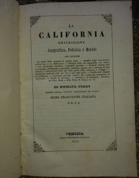 In-8 (21 cm) 340 (2) (12) c. (di tavole incise). Frontespizio e testo scritto dentro riquadro inciso. Mezza pelle. Lieve alone di gora nella seconda metà del volume. Titolo completo :"La California: descrizione geografica, politica e morale che contiene la storia della scoperta di questa terra. Quadro degli avvenimenti politici che vi si effettuarono. Dettagli della sua topografia, sul clima, e sulle produzioni minerali, vegetabili, animali. Nozioni intorno alla mineralogia, metallurgia e geologia, carattere, spirito, usi e costumi de' suoi abitanti. Descrizione delle sue baie, porti, di città, missioni, e villaggi. Cognizioni nautiche sulle sue baie e sui suoi porti. Tariffa delle dogane in California. Istruzioni generali relative alle strade che conducono in California, ai luoghi di passaggio, e descrizioni di Changres, Panama, del Capo Horn e della Terra di Fuoco, ec. ec. Di Ippolito Ferry membro della società geografica di Parigi. Prima traduzione italiana di s. d. s.". Rara edizione italiana del cartografo francese che tra i primi descrisse in maniera particolareggiata la California, terra che riscuoteva un interesse internazionale per la celebre corsa all'oro. (EN) In-8 (21 cm) 340 (2) (12) c. (of engraved plates). Title page and text written inside engraved frame. Half leather. Slight halo of gora in the second half of the volume. Complete title: "California: geographical, political and moral description which contains the history of the discovery of this land. Overview of the political events that took place there. Details of its topography, climate, and mineral, vegetable and animal production. Notions about the mineralogy, metallurgy and geology, character, spirit, habits and customs of its inhabitants. Description of its bays, ports, cities, missions, and villages . General instructions relating to the roads leading to California, the places of passage, and descriptions of Changres, Panama, Cape Horn and Tierra di Fuego, etc. By Ippolito Ferry member of the geographical society of Paris s. d. s.". Rare Italian edition by the French cartographer who was among the first to describe California in detail, a land that attracted international interest due to the famous gold rush.