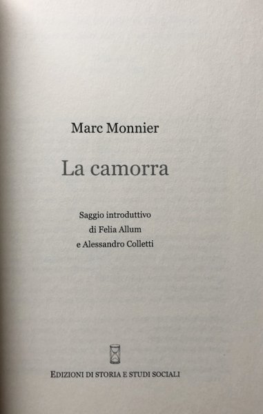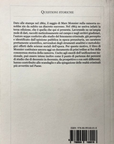 Dato alle stampe nel 1862, il saggio di Marc Monnier sulla camorra conobbe sin da subito un discreto successo. Nel 1863 ne usciva infatti la terza edizione, che è quella che qui si presenta. Lavorando su un'ampia mole di dati, raccolti meticolosamente sul campo e negli archivi giudiziari, l'autore seppe conferire allo studio del fenomeno criminale, già percepito e identificato dall'opinione pubblica in epoca preunitaria, un carattere prettamente scientifico, servendosi degli strumenti analitici e metodologici offerti dalle scienze sociali dell'epoca. Per questo motivo, il libro di Monnier costituisce ancora oggi un documento di prim'ordine ai fini della conoscenza storica della camorra. Uscito agli esordi dell'unificazione nazionale, può essere inteso inoltre come il punto di partenza dei percorsi di studio che di decennio in decennio, da prospettive e con esiti differenti, hanno contribuito allo scandaglio e alla spiegazione delle realtà criminali più avvertite nel Paese.