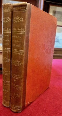 8vo (cm. 21,5), 2 Voll.; XLIX(1)-312 pp., 88 pp. con una tavola più volte ripiegata f.t. (’Pianta del campo di battaglia di Magenta’); 626 pp. Assente la tavola f.t. relativa alla battaglia di Solferino. Legature coeve in mz. pelle con fili, fregi e titoli impressi in oro al ds. Esemplare in ottimo stato di conservazione. Provenienza: Collezione Spina, Avezzano (timbretti ex libris).