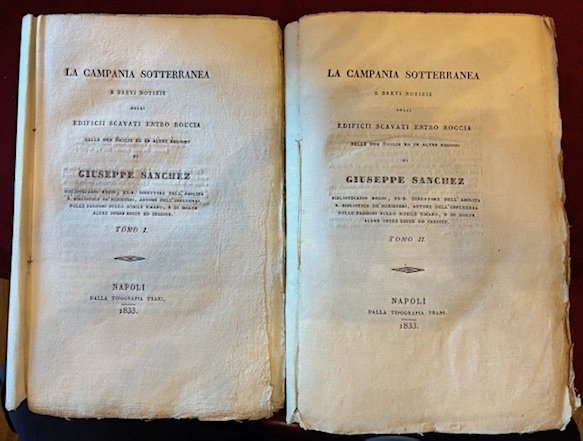 8vo (cm. 23,2), 2 Voll.; XIV pp., 1 c.nn., da p. 17 a p. 288; 2 cc.nn., da p. 289 a p. 655(1) pp. Brossure d’attesa coeve (logore e con alcune mancanze). Ottimi e freschi interni in barbe. Opera fondamentale ed esaustiva sulle grotte, gli antri, le catacombe ed i sotterranei. Dopo un’analisi generale riguardante vari paesi del mondo, l’Autore esamina lungamente e nei particolari il Regno delle due Sicilie e la città di Napoli. Raro.