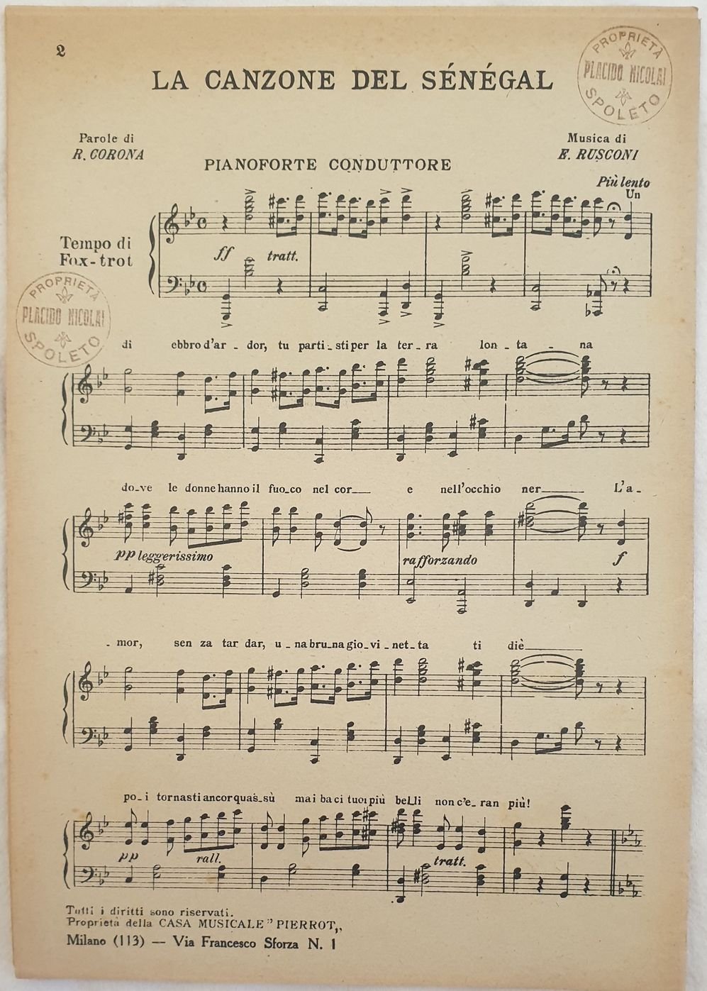 Partitura per orchestra degli anni '20 della melodia di E. Rusconi "La canzone del Senegal". Parole di Romolo Corona. Copertina assente. GENERE: Fox trot STRUMENTI: pianoforte, violino, violoncello, contrabasso, trombone, clarino, flauto, batteria<BR>ANNO: anni '20 DIMENSIONI: In 8. cm 25x18 PAGINE: pp. 10 CONDIZIONI: Discrete condizioni. Ex libris in copertina. Complete score for orchestra of 1920's of the melodies of E. Rusconi "La canzone del Senegal". Words of Romolo Corona. Cover lacks. MUSIC: Fox trot STRUMENTI: piano, violin violoncello, contrabbass, trombone, clarion, flute, drums<BR>YEAR: 1920's SIZE: In 8. cm 25x18 PAGES: pp. 10 CONDITIONS: Fair conditions. Ex libris in the cover