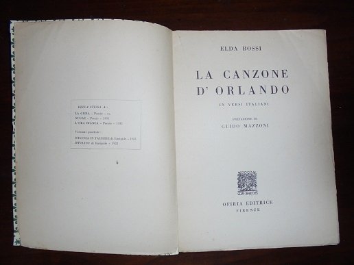 LA CANZONE DI ORLANDO. IN VERSI ITALIANI Prefazione di Guido Mazzoni.