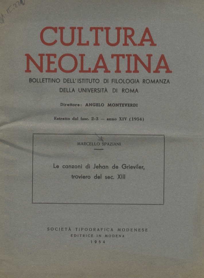 La canzoni di Jehan de Grieviler troviero del sec. XIII.