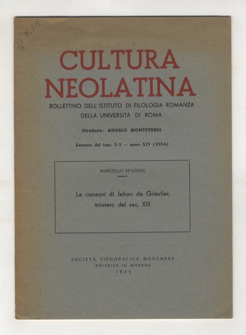 Modena, Società Tipografica Modenese, 1954, in-8, br. editoriale, pp. 19, [1]. Estratto da "Cultura latina", fasc. 2-3, anno XIV.