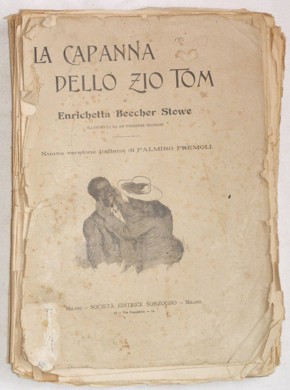 In 4. Dim. 32x22 cm. Pp. 279. Edizione senza data ma dei primi anni del 1900 di questo romanzo della scrittrice americana Herriet Beecher Stowe (1811-1896). Traduzione italiana di Palmiro Premoli. All'interno sono presenti numerosi incisioni nel testo (vedere foto). L'opera venne pubblicata per la prima volta nel 1851 ed ebbe un peso determinante negli Stati Uniti per la causa dell'abolizione della schiavitù dei neri. Brossura editoriale in cattive condizioni generali con lievi usure ai margini e dorso; piatto posteriore e dorso assente. Legatura quasi assente ma nessuna pagina mancante. All'interno le pagine si presentano in discrete condizioni con rare fioriture e margini usurati. Not dated edition but of the first years of 1900 of this novel by the american writer Herriet Beecher Stowe (1811-1896). Italian translation by Palmiro Premoli. Inside there are different engravings in the text. The work was published for the first time in1851 and was important to abolish the slavery for black people. Editorial cover in bad general conditions with worn edges and spine; back plate and spine missing. Binding is almost missing but no page is missing. Inside pages are in fair conditions with occasional foxings and worn edges.