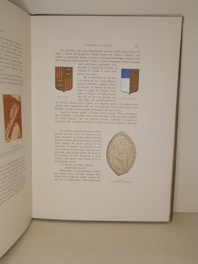 In folio, cm. 40, pp. 103, rilegatura in mezza pelle editoriale con piatto cartonato con illustrazione a colori in rilievo. Molto buono lo stato di conservazione, leggermente polverosi i piatti e i margini riportano minimi segni d'uso. Presenti numerose illustrazioni alcune fuori testo protette da velina, altre nel testo in bianco e nero. La Cappalla del Santo Sepolcro, Coro della Chiesa di San Giovanni in Saluzzo e Tomba dei Marchesi di Saluzzo.. *** TUTTI I NOSTRI LIBRI SONO VISIBILI PREVIO CONTATTO MAIL O TELEFONO NELLA NUOVA SEDE DI MILANO: LIBRERIA COSMOPOLIS, VIA JOMMELLI, 22. ***