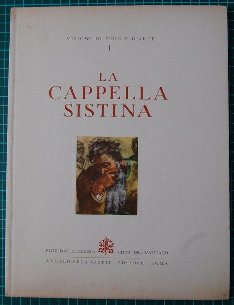 Un volume, 30 x 22,5 cm; pp. 15, (3), XLIII tav., (1); leg. ed. in cartone rivestito da sovracoperta bianca con chiusura a busta, con titolo al dorso e al piatto ant. a caratteri rossi e neri, con piccola riproduzione a colori di un'opera della Cappella Sistina, ulteriore velina di copertura (con tracce d'uso e piccole rotture); occhietto, front. con titolo a caratteri rossi e neri e con stemma editoriale della Città del Vaticano; introduzione e note, elenco tavole, tavole a colori e in b/n. alcune più volte ripiegate; opera facente parte della collana Visioni di fede e d'arte (n. 1). L'anno di pubblicazione non è indicato, ma dovrebbe essere circa il 1950. Rif.: IT\ICCU\RMR\0012415. Cond.: opera in condizioni generali molto buone.