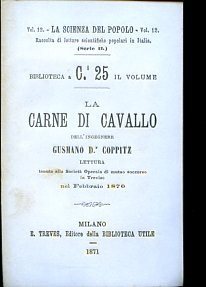 In-24°, pp. 32, brossura editoriale. Perfetta copia intonsa. Conferenza sui benefici alimentari della carne equina. La Scienza del Popolo. Raccolta di letture scientifiche popolari fatte in Italia. Vol. 12, serie II.