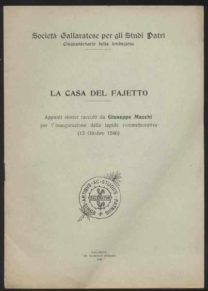 La casa del Fajetto - Appunti storici raccolti da Giuseppe Macchi per l'inaugurazione della lapide commemorativa (13 ottobre 1946)