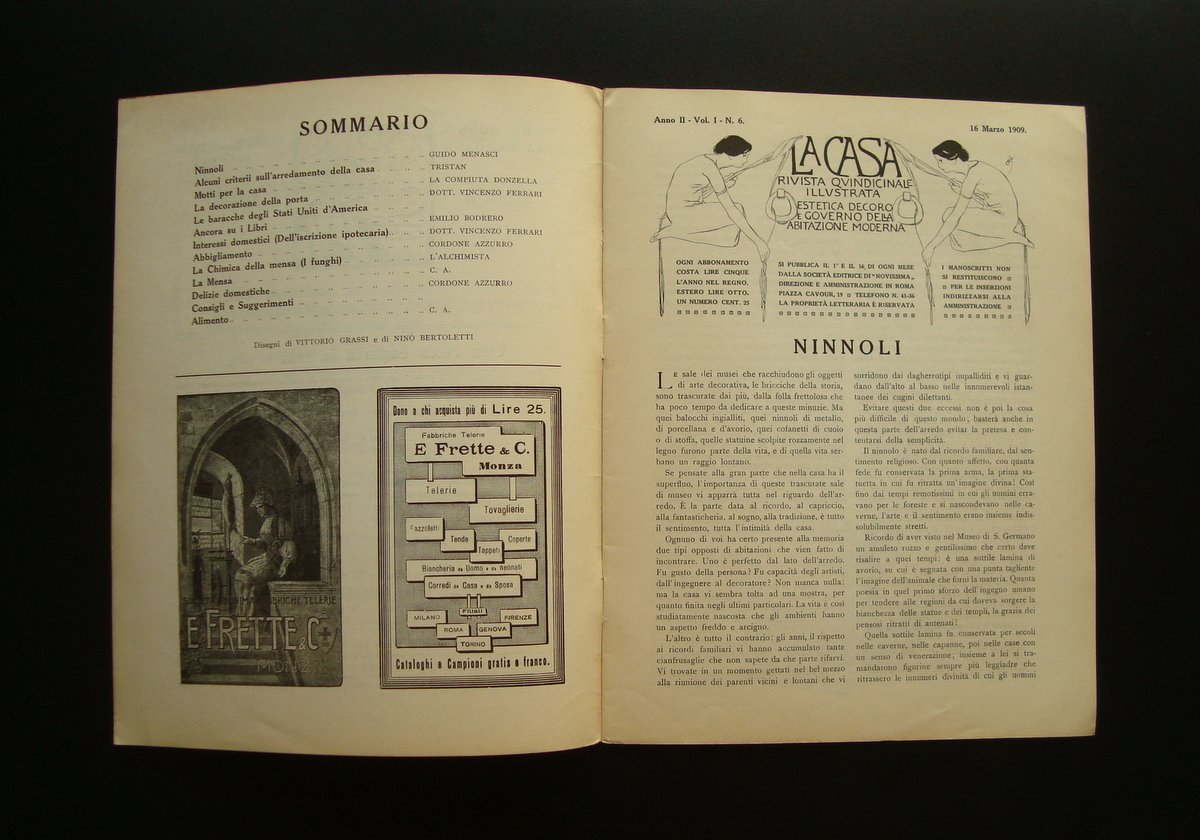 Rivista quindicinale illustrata, La Casa" "Estetica, Decoro e Governo dell'Abitazione Moderna" Anno II - Vol.I - N. 6 16 Marzo 1909 Società Editrice di "Novissima", Roma, 1909, cm 25x18,5, pp. da 102 a 120 (numerazione annuale); brossura ed. con ill. fotografiche in b/n. e disegni di Grassi, Bertoletti. Numero completo. Condizioni di conservazione Esemplare in buone condizioni con tracce leggere d'uso e del tempo; brossure con qualche minima brunitura ai margini e al dorso; interni buoni Numero completo. RVS001N00187 "
