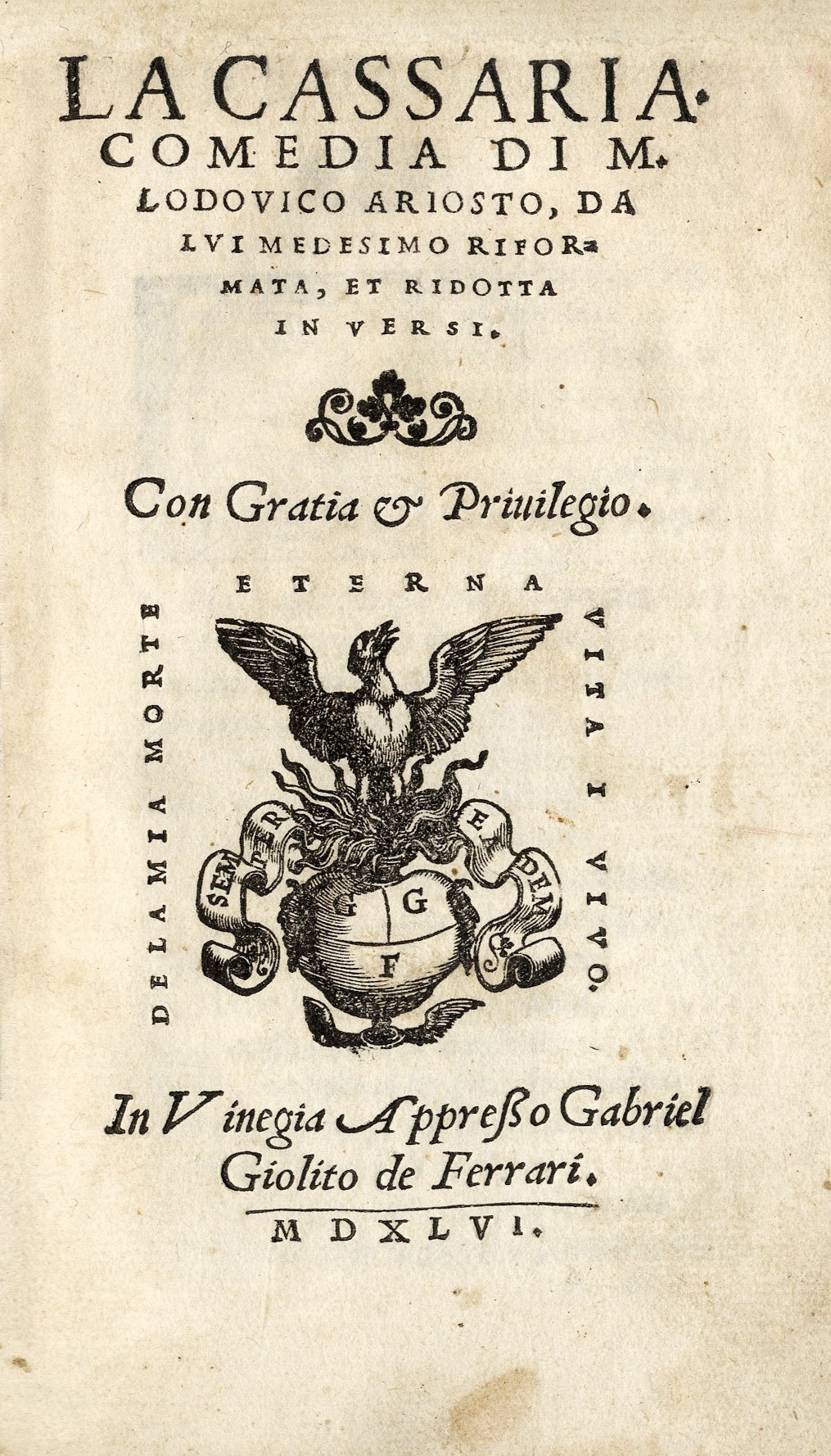 >in-8, ff. 56, leg. secentesca cart. rustico. Impresa tipogr. al tit., fregi ed iniz. silogr., car. corsivo. Prima edizione della versione in versi della Cassaria, rara ed importante commedia in cinque atti (l'ediz. orig. in prosa è del 1525) ridotta in versi dall'Ariosto stesso (solo il Prologo, parimenti in versi, era già apparso nelle edizioni dello Zoppino, 1538, e di Bindoni, 1542). ''Gio. Batt. Cintio Giraldi scrive, che la Cassaria è la più degna fra le italiane commedie de' tempi suoi, e da essere paragonata alle antiche latine'' (Gamba). Primo lavoro teatrale dell'Ariosto (1474 - 1533), composto nei primi anni del secolo, se è vero che la commedia ''venne rappresentata primieramente nel 1502 in occasione delle nozze di Alfonso d'Este con Lucrezia Borgia'' (Agnelli-Ravegnani II, 83); per altri critici, invece, fu composta nel 1507 e rappresentata a Ferrara durante il carnevale nel marzo del 1508 (Renda-Operti p. 73 e DBIt. IV, p. 180). La scena è collocata a Metellino (a Sibari nella redazione in versi) ''Come si sa, la Cassaria ed I Suppositi furono scritte dall'Ariosto in prosa nella sua gioventù, e poi, assai più tardi, riformate in versi'' (Agnelli-Ravegnani II, 83 e 90) Bell'esempl. a pieni margini. Manca ad Allacci e Regensten. Agnelli-Ravegnani II, 89. Bongi I, 517. Clubb 94. Gamba 76: «Prima edizione, e tra quelle del Giolito, la più rara». Salvioli 673. Cat. Unico A-2605.