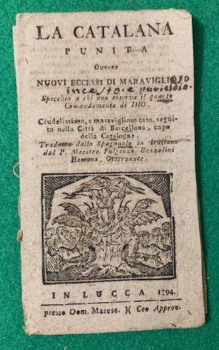 In 12°; (14,5x8,2 cm); (12) pp. Senza borssura. Una piccolissima mancanza di carta al margine interno basso della prima carta, ininfluente. Alcune note manoscritte coeve (al frontespizio le parole incesto e paricidio) e sottolineature nel testo. Allinterno esemplare in buone-ottime condizioni di conservazione. Bellissima scena xilografica al frontespizio con strega che brucia nelle fiamme sorretta da due demoni. Rarissima edizione di questa placchetta curiosa che narra una storia di magia, incesto, stregoneria, assassinii, parricidio, avvelenamenti, rapimenti e miracoli avvenuti a Barcellona. Rarissimo, nessun esemplare censito in ICCU in questa edizione edita da Marescandoli a Lucca nel 1794. Magnifica la tavola xilografica al frontespizio. Rare.